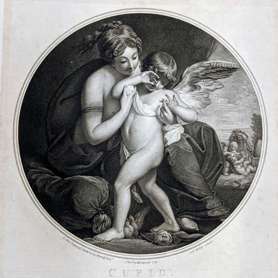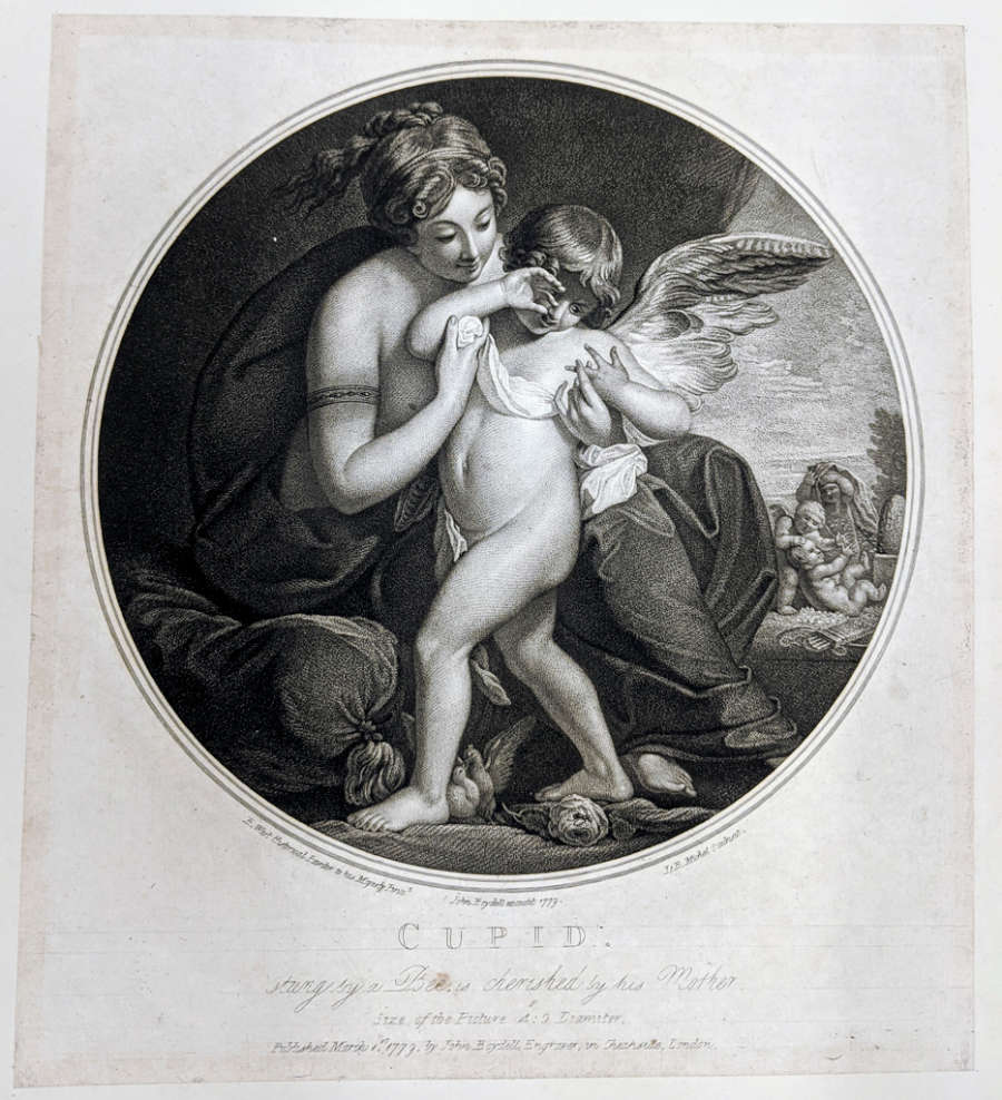 Original--Recto:numbered in pencil in LC of mount:No. 49In Plate--inscribed along bottom curve of image:B. West Historical Painter to his Majesty Pinx† John Boydell excudit 1779. I.B. Michel Sculpsit.; titled & inscribed in LC:CUPID./Stung by a Bee, is cherished by his Mother/f/Size of the picture A: O Diameter./Published March 1st 1779, by John Boydell, Engraver in Cheapside, London.