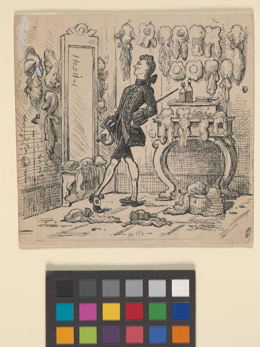 Dandy Standing in Front of Mirror Surrounded by Wigs, mid 1800s-early 1900s