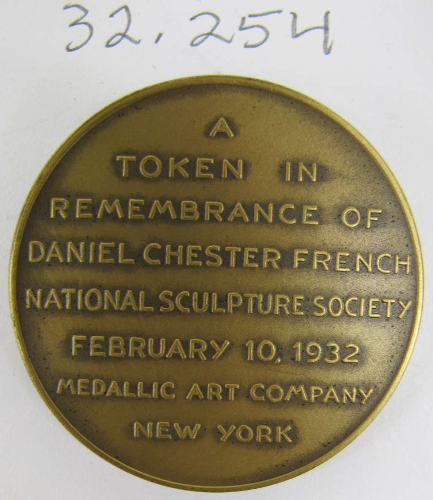 Rev: A TOKEN IN REMEMBRANCE OF DANIEL CHESTER FRENCH NATIONAL SCULPTURE SOCIETY FEBRUARY 10,1932 MEDALLIC ART COMPANY, NEW YORK.