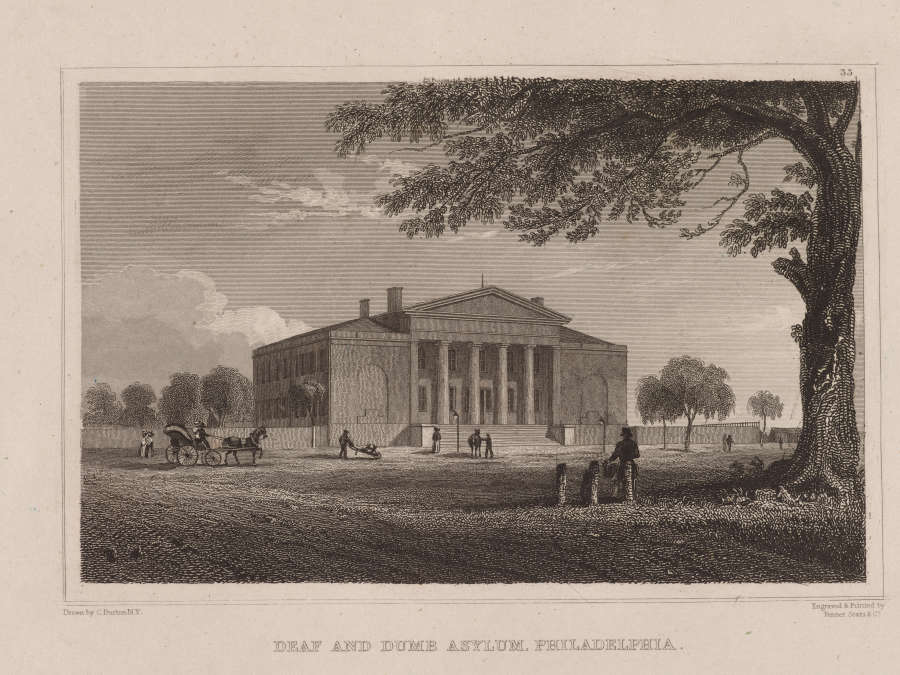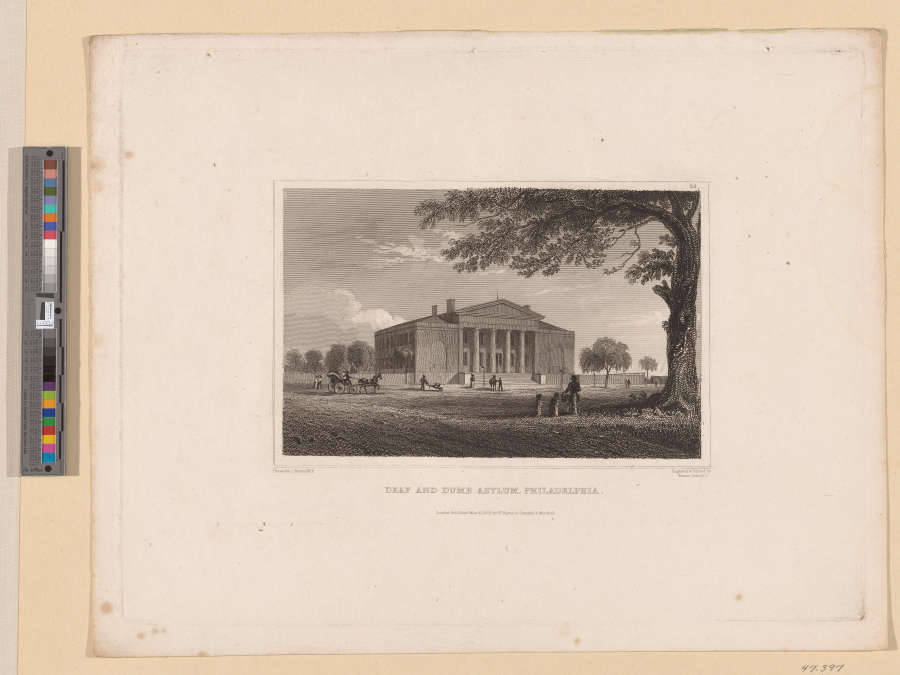 in Plate--under image on left:Drawn by C. Burton N.Y.; on right:Engraved & Printed by /Fenner Sears & Co.; in center:DEAF AND DUMB ASYLUM, PHILADELPHIA./London Published March 1.1831 by I.T. Hinton & Simpkin & Marshall; numbered in UR:33