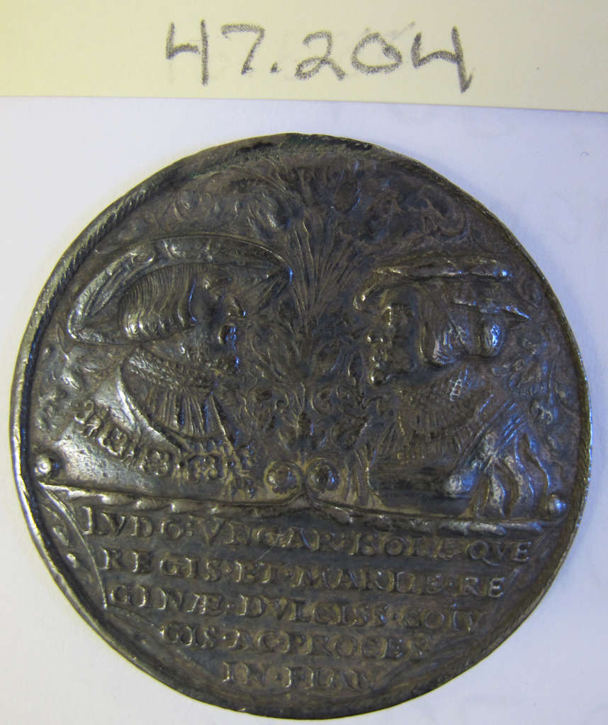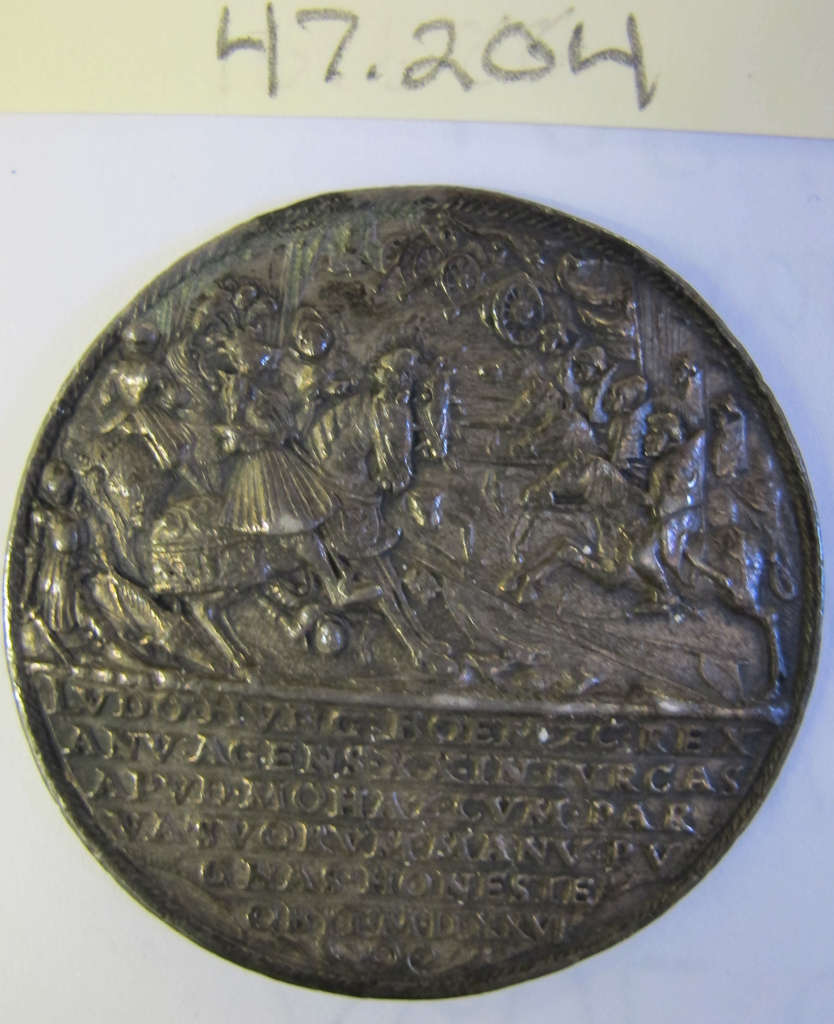 Legend on shield under the busts: LVDO (vicus) VNGAR (iae): BOHE (miae): QVE/REGIS. ET. MARIAE. RE/GINAE. DVLCISS (imae) CONIV/GIS. AC. PROCES(are) IN. FLAN(dria). Rev: Battle scene. Legend, similar to obv.: LVDO: HVNG: BOEM: ETC. REX/ANZ(m): AGENS: XX. IN. TVRCAS/ APVD. MOHAZ. CVM. PAR/VA. SVORVM. MANV. PV/GNA (n)S. HONESTE/OBYT. MDXXVI.