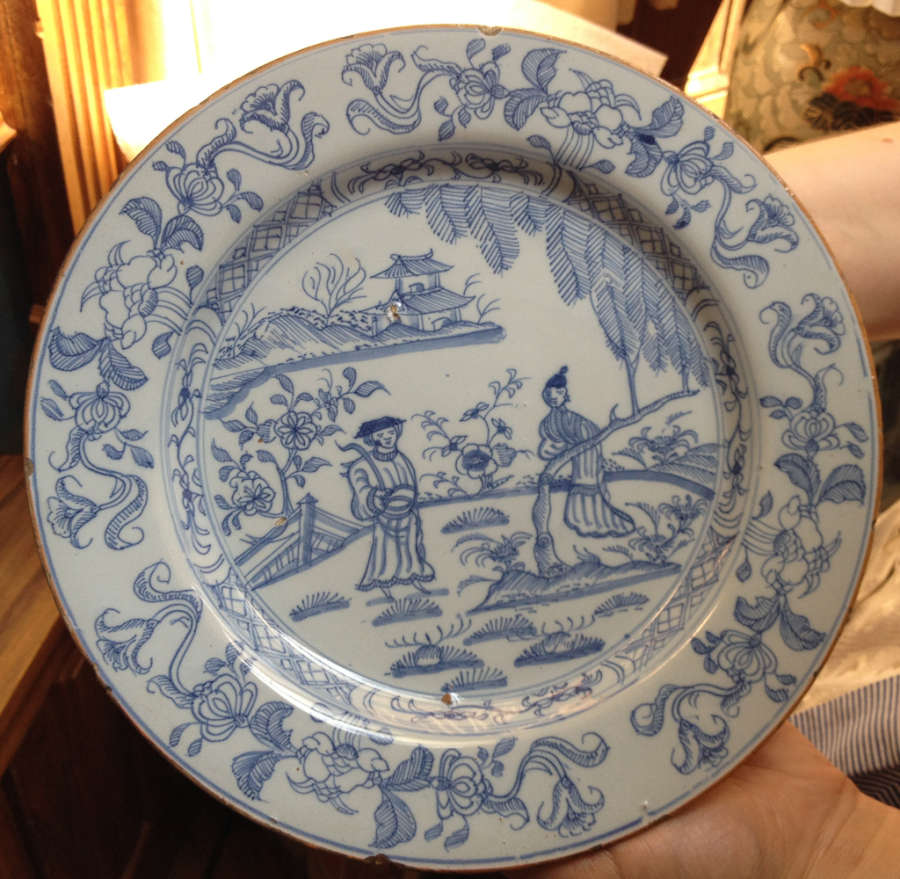 On bottom of plate: [written in black marker, hardly visible] "Monahon." [round white sticker] "William & Gretchn Viall Collection." [white rectangle sticker] "Liverpool 1742/John C. Austin page/158+p.27." [white rectangle sticker] "Liverpool? Elenor Monahon collection 12/19/91."