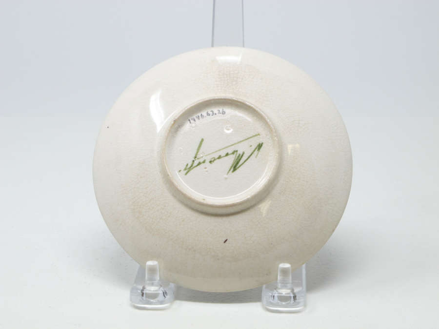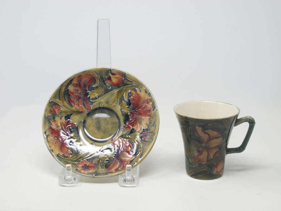 Marks: Inscribed on underglaze green, on underside of cup and saucer: "Moorcraft" in script/cursive.