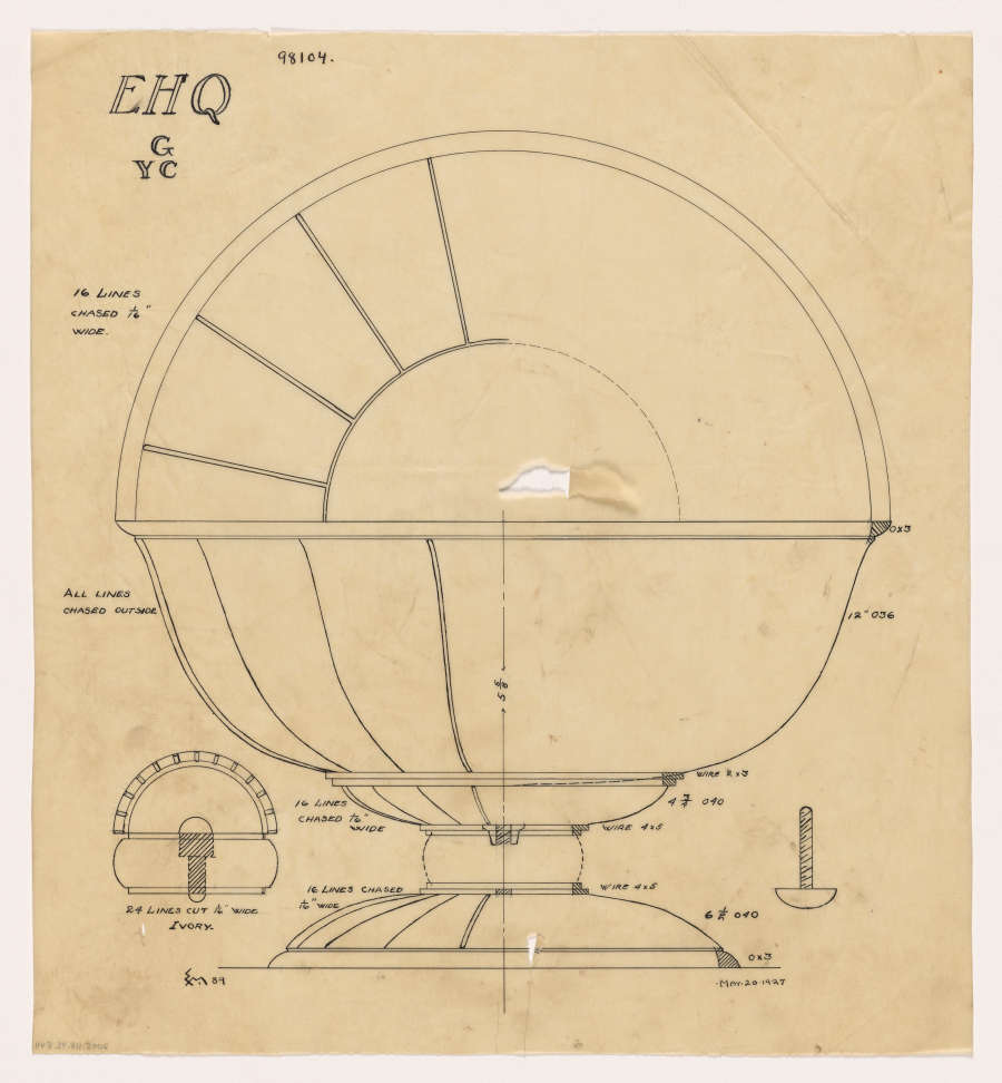 "EM. 89" in ink in lower left corner. "MAY.20.1927" in ink in lower right corner. "98104 / EHQ / G/YC" in ink in upper left corner. "16 LINES / CHASED 1/16" / WIDE" to left of plan view. "ALL LINES / CHASED OUTSIDE" to left of bowl. "OX3" and "12" 036" to right of bowl. "5 5/8"" with arrow indicating height of bowl. "16 LINES / CHASED 1/16" / WIDE" to right of bowl's bottom, "WIRE 2X3 / 4 3/4 040 / WIRE 4X5" to right of bowl's bottom. "16 LINES CHASED / 1/16" WIDE" to left of base, "WIRE 4X5 / 6 1/2 040 / 0X3" to right of base. "24 LINES CUT 1/16" WIDE / IVORY" below plan view of shaft's disk.