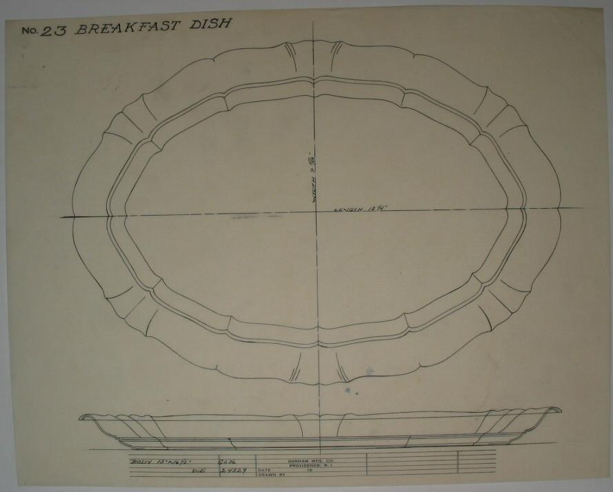 "No. 23 BREAKFAST DISH" in ink in upper left corner. "WIDTH 9 5/8"" marks height of plan view in ink, "LENGTH 13 1/4"" marks width of plan view in ink. Data field at bottom margin filled in, in ink, with "BODY 13" X 16 1/2"G036 / DIE 24329"in left column.