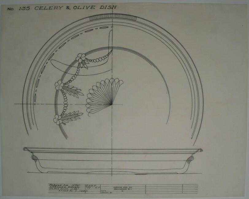 "No. 135 CELERY & OLIVE DISH" in upper left corner in ink.Data field at bottom margin filled in with "FLANGE CIR 13 3/4" G025 / EMBOSSED BORDER 177-L-1 / FLASS DISH 11 7/8" / STYLE AS Y 1128/1" in left column.