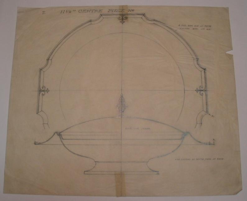 "7. 11 1/2" CENTRE PIECE No" written in pencil across top of drawing, "4 PCS. BOR DIE No 7858 / ROLLED BOR. No 621" written in upper right corner next to arrow pointing to rim of bowl in plan view, "REGULAR MESH" written on bowl's lid in profile view, "USE CHUCKS OF CENTRE PIECE No 9902" written to right of bowl in profile view.
