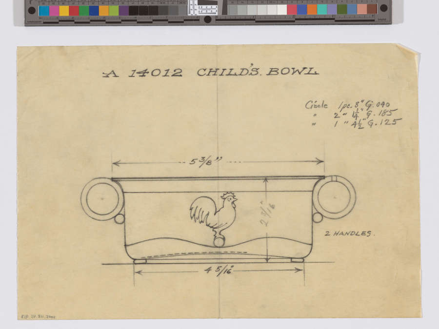 In pencil: "A 14012 CHILD'S BOWL" across top of page, "Circle 1pc. 8" G.040 / " 2" 1 1/4 G.185 / " " 4 1/2 G.125" in upper right corner. "5 3/8"" marks diameter of bowl, "2 3/16"" marks height of bowl, "4 5/16"" marks diameter of base. "2 HANDLES" below right handle.