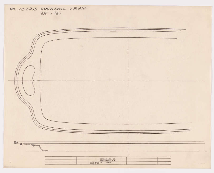 "No. 13723 COCKTAIL TRAY / 8 1/2" x 18"" in ink in upper left corner. Data field at bottom filled in, in ink, with "DATE AUG 8 1928" in center column.