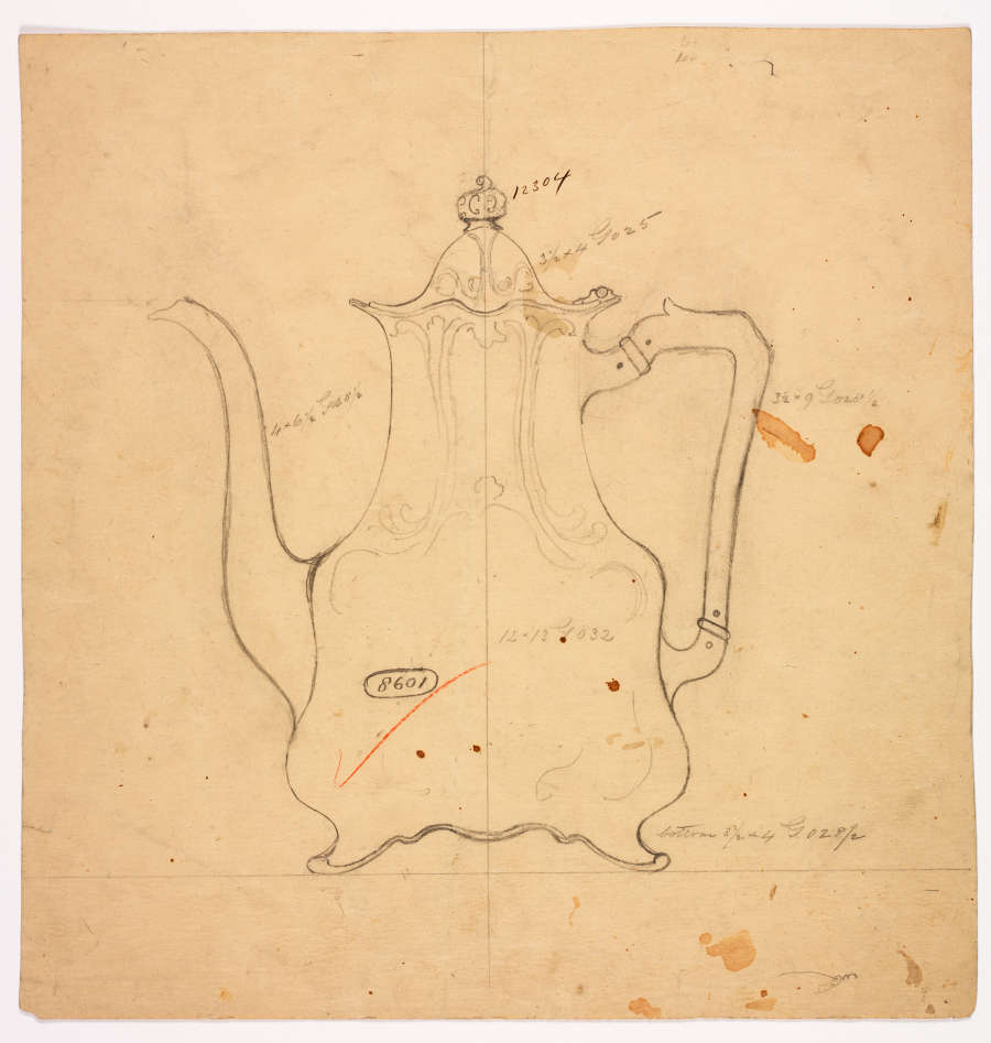 In pencil on surface of pot, circled, "8601". Various manufacturing specifications and dimensions on drawing in pencil.