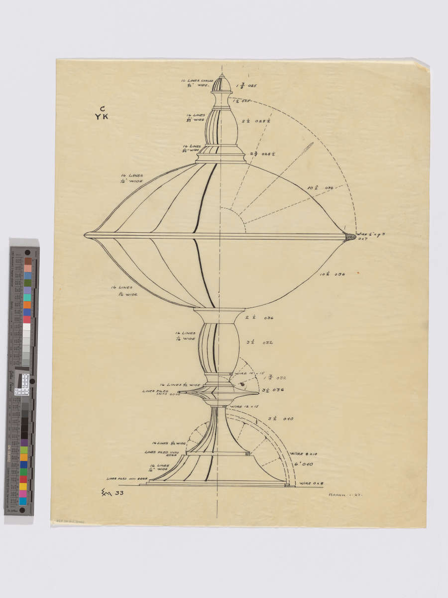 "C/YK" in ink in upper left corner. "EM. 33" in ink in lower left corner of drawing. ".MARCH. 1. 27." in ink in lower right corner of drawing. In ink around finial of compote, "16 LINES CHASED / 1/32" WIDE.", "1 3/8 025","1 1/2 025", "16 LINES / 1/32" WIDE", "2 1/2 028 1/2", "16 LINES / 1/32" WIDE", "2 3/4 028 1/2". To left of lid, "16 LINES / 1/16" WIDE". To right of lid, "10 1/2 032". To right of rim, "WIRE 1/2" X g 3 / 0X7". To left of cup, "16 LINES / 1/16 WIDE". To right of cup, "10 1/2 036". Down left side of shaft and base, "16 LINES / 1/16 WIDE / 16 LINES 1/32 WIDE / LINES FILED / INTO EDGE / 16 LINES 1/32 WIDE / LINES FILED INTO / EDGE / 16 LINES / 1/16" WIDE / LINES FILED INTO EDGE". Down right side of shaft and base, "2 1/2 036 / 3 1/2 032 / WIRE 14 X 15 / 1 3/4 032 / 3 1/2 036 /WIRE 12 X 15 / 3 1/2 040 / WIRE 8X10 / 6" 040 / WIRE 0X8".