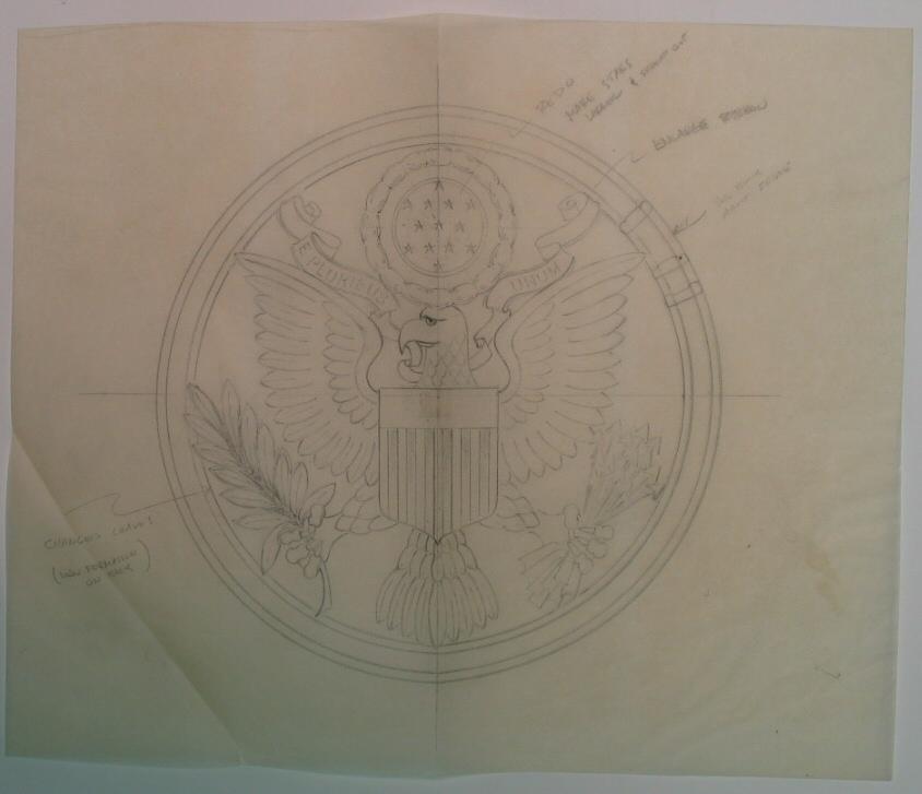 With arrows pointing to various parts of US seal "CHANGED LEAVES", "NEW FORMATION ON BACK", "REDO", "MAKE STARS LARGER & SPREAD OUT", "ENLARGE RIBBON", AND "[SEL BURN] ABOUT FRAME". At center on ribbon around eagle "E PLURIBUS UNUM".