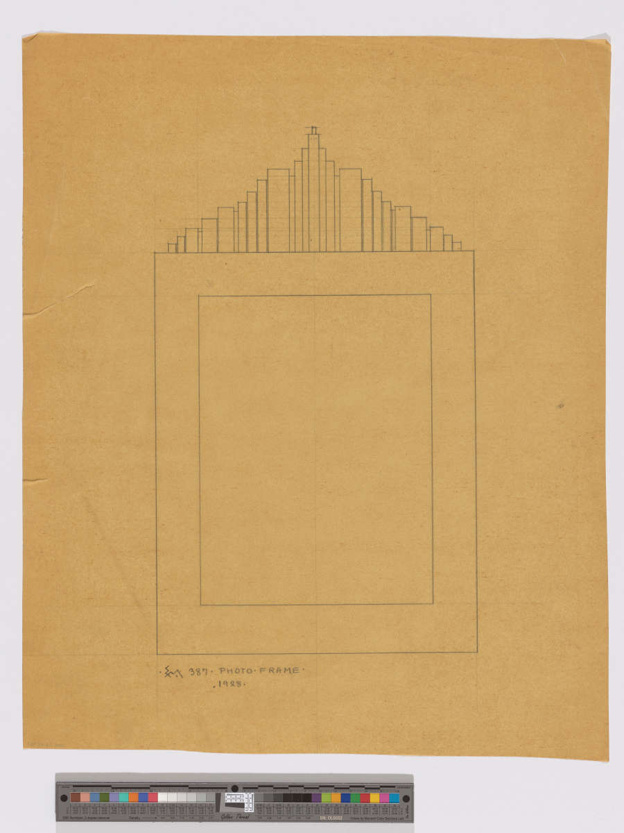 In pencil in lower left corner, "EM. 387. PHOTO. FRAME. / .1928."