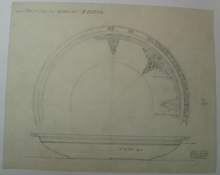 "11 1/2 IN FRUIT (SALAD) DISH No A 20286" across top of page. "EMB. TOOL No22781" and "EMB. TOOL No 22781" with arrows pointing to cartouche decorations around rim. "Nov / 15 / 1928" along right edge of paper. "13"G_030 Spun" within profile view. "TOOL #469" with arrow pointing to rim of profile. "SPUN (NEW) / BORD. ROLLED / REST EMBOSSED / & ENGRAVED" in lower right corner.