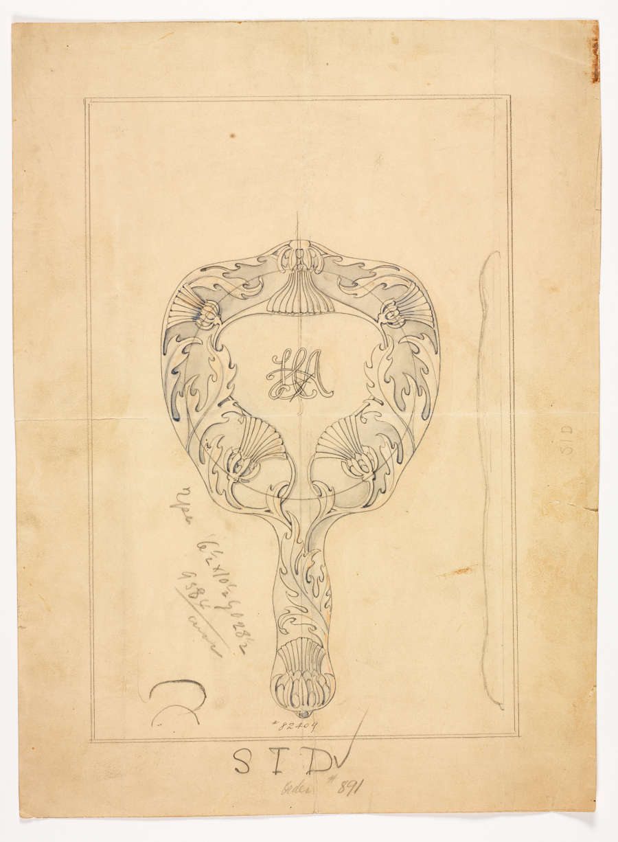 In ink below center of mirror "#82409". In pencil at bottom center "SID / Order #819". Inscription on back of mirror "HA".