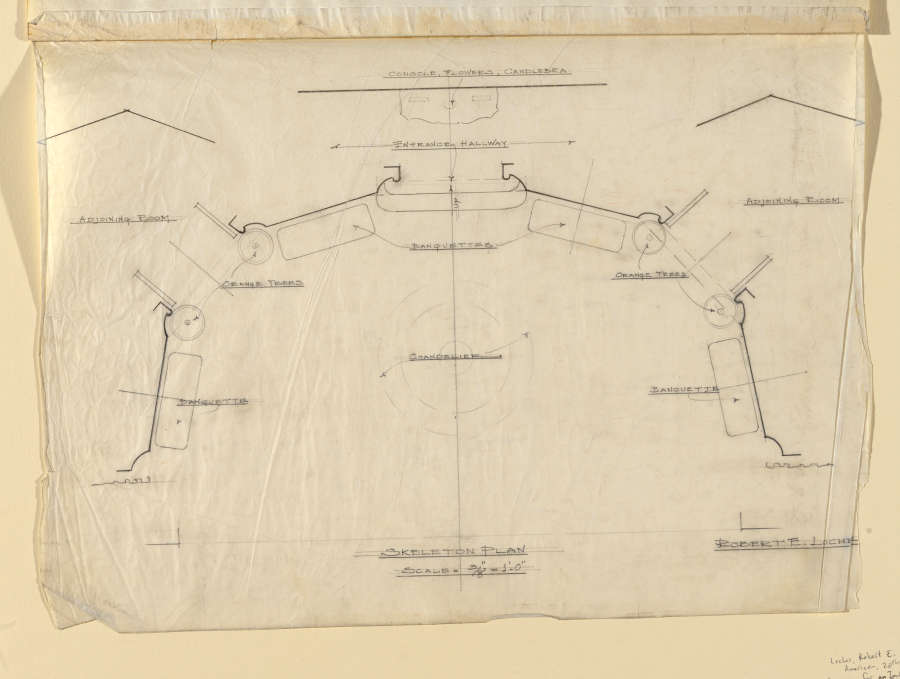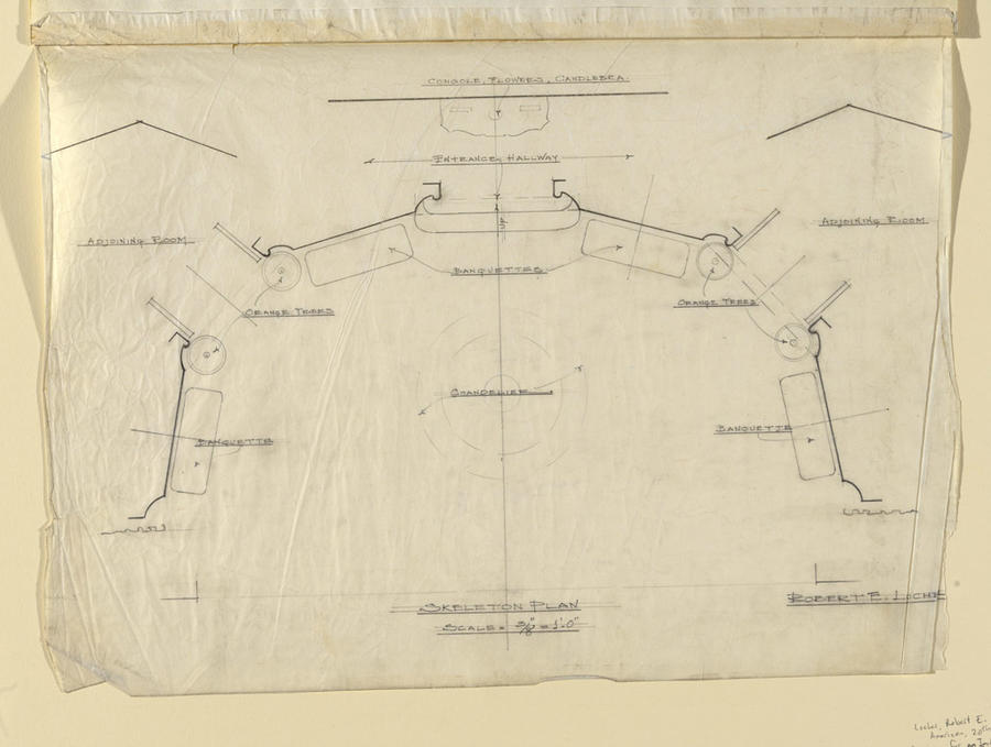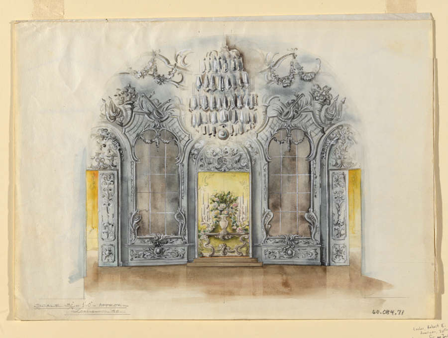 Label: typed sheet attached to verso of watercolored sheet- states the setting is designed after the great room in the Amaleinbourg Castle, Nymphenburg, and goes on to describe the layout of the room. Credit / Object Number