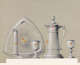 "IN HOC / SIGNO / VINCES" around rim of triangular plate. "34 oo EA / 408.00 D02" in pencil at left under candlestick, "180.00" below plate in pencil, "#1 / 38.50 EA / 412.00 D02" in pencil below left wine glass, "#11614A" in ink and "275.00" in ink below flagon, "#2" in ink and "43.00 EA / 516.00 DO2." in pencil below chalice.