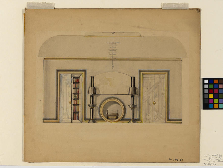 The images on this website can enable discovery and collaboration and support new scholarship, and we encourage their use. This object is in Copyright. This object is Design for a Living Room (Decorated Bookcases & Doors) with the accession number of 60.084.79. To request new photography, please send an email to imagerequest@risd.edu and include your name and the object's accession number.