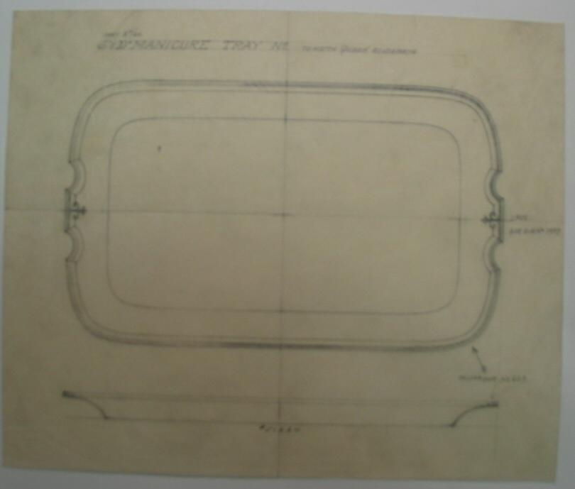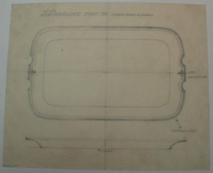 "MAY. 8th/24. / 6" X 10" MANICURE TRAY No-TO MATCH QUEEN ELIZABETH" written in pencil across top of drawing. "2 POS. / BOR DIE No 7859" in right margin. "ROLLED BOR. No 623" with arrow pointing to borders of both the plan and profile view. "#51224" in pen below profile of tray.