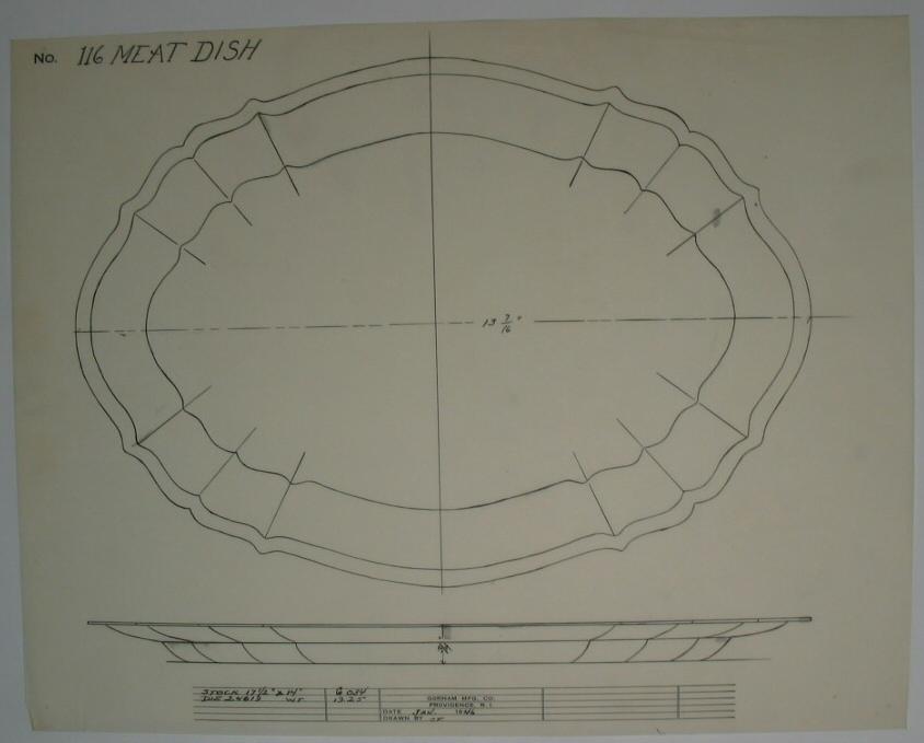 "No. 116 MEAT DISH" in upper left corner. "13 7/16"" indicates width on plan view. Data field at bottom margin filled in with "STOCK 17 1/2" X 14" G034 / DIE24619 WT 1925" in left column and "DATE JAN. 1946 / DRAWN BY CF" in center column