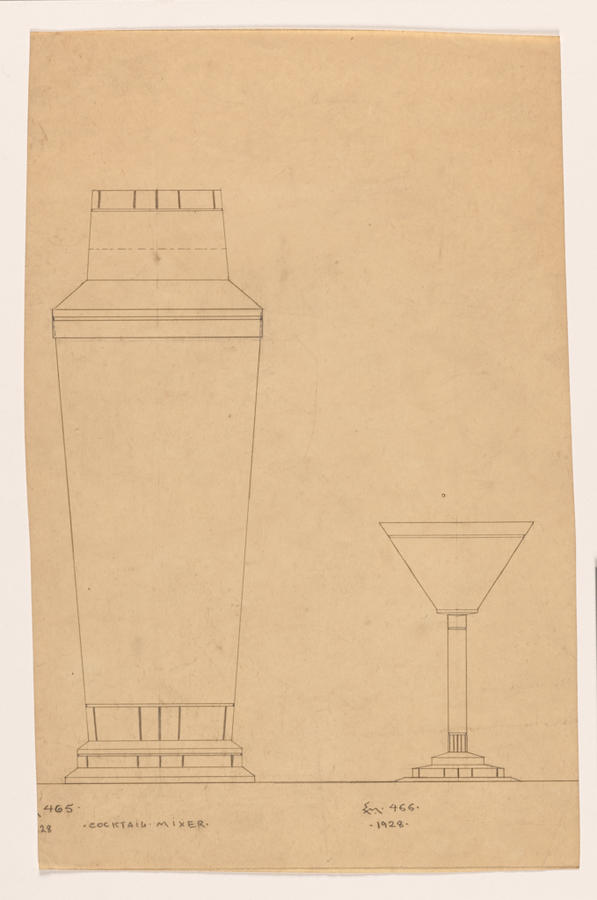 All in pencil: "465 / [19]28 . COCKTAIL . MIXER." to bottom of drawing of cocktail mixer. "EM. 466 / .1928." below cocktail glass.