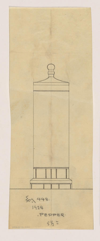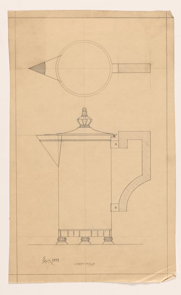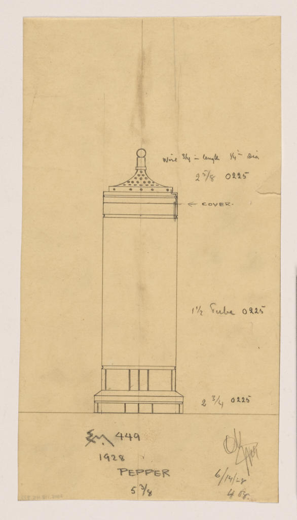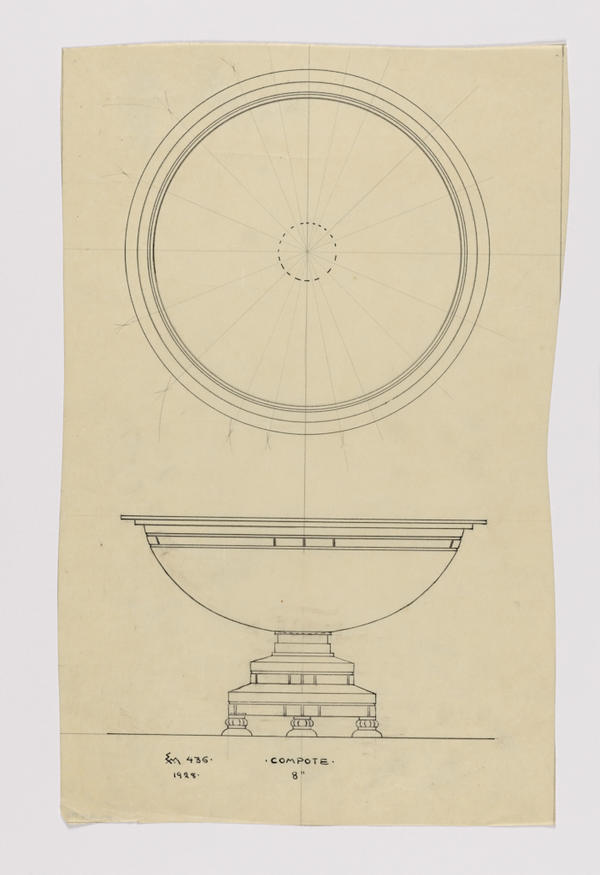 All in pencil: "CREAM EM. 1928 / 428 / MAY 1" below creamer, "EM. 429 / MAY 1 / 1928" below sugar bowl. "TURN" to left of feet on creamer, "TURN / IVORY / TURN" to right of sugar bowl's finial.