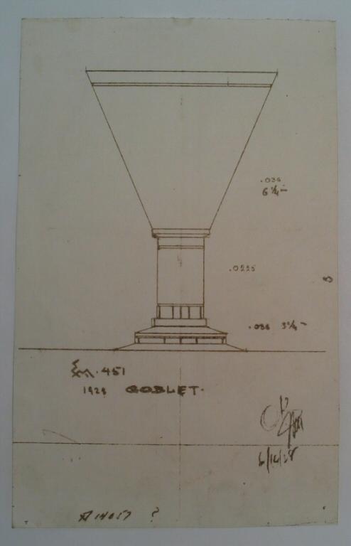 "EM. 451 / 1928 GOBLET." below drawing. ".036 / 6 1/4 in / .0225 / .036 3 1/4in" along right margin. "OK [?] / 6/14/28" in script in lower right corner. "A14057?" in pencil at bottom center of paper.