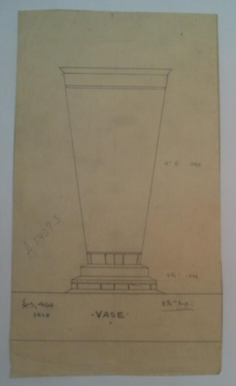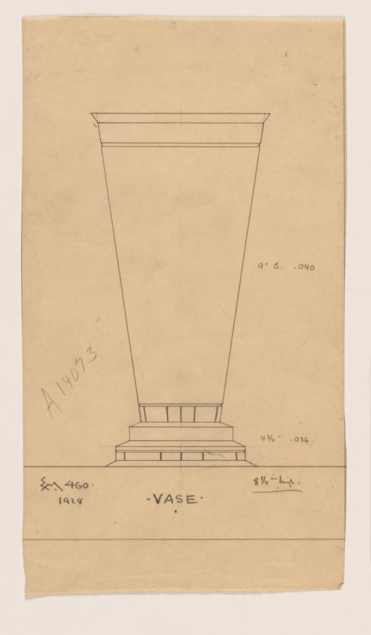 All in pencil: "EM. 460. / 1928" to lower left of drawing. ". VASE . " below drawing. "8 1/4 in high." to lower right of drawing. "A14073" to left of vase's body. "9" C. 040" to right of vase's body, "4 3/4" .036" to right of vase's base.