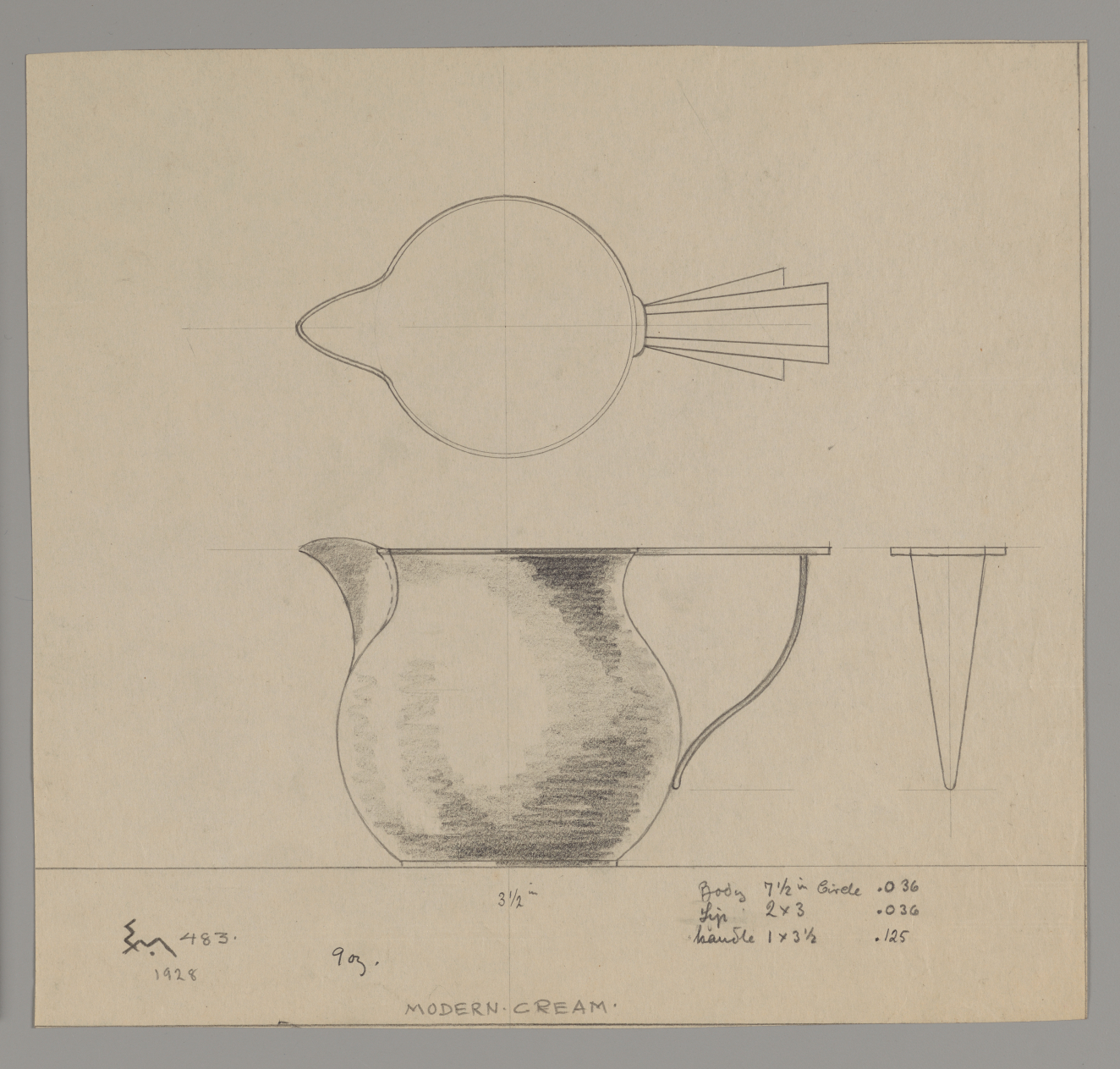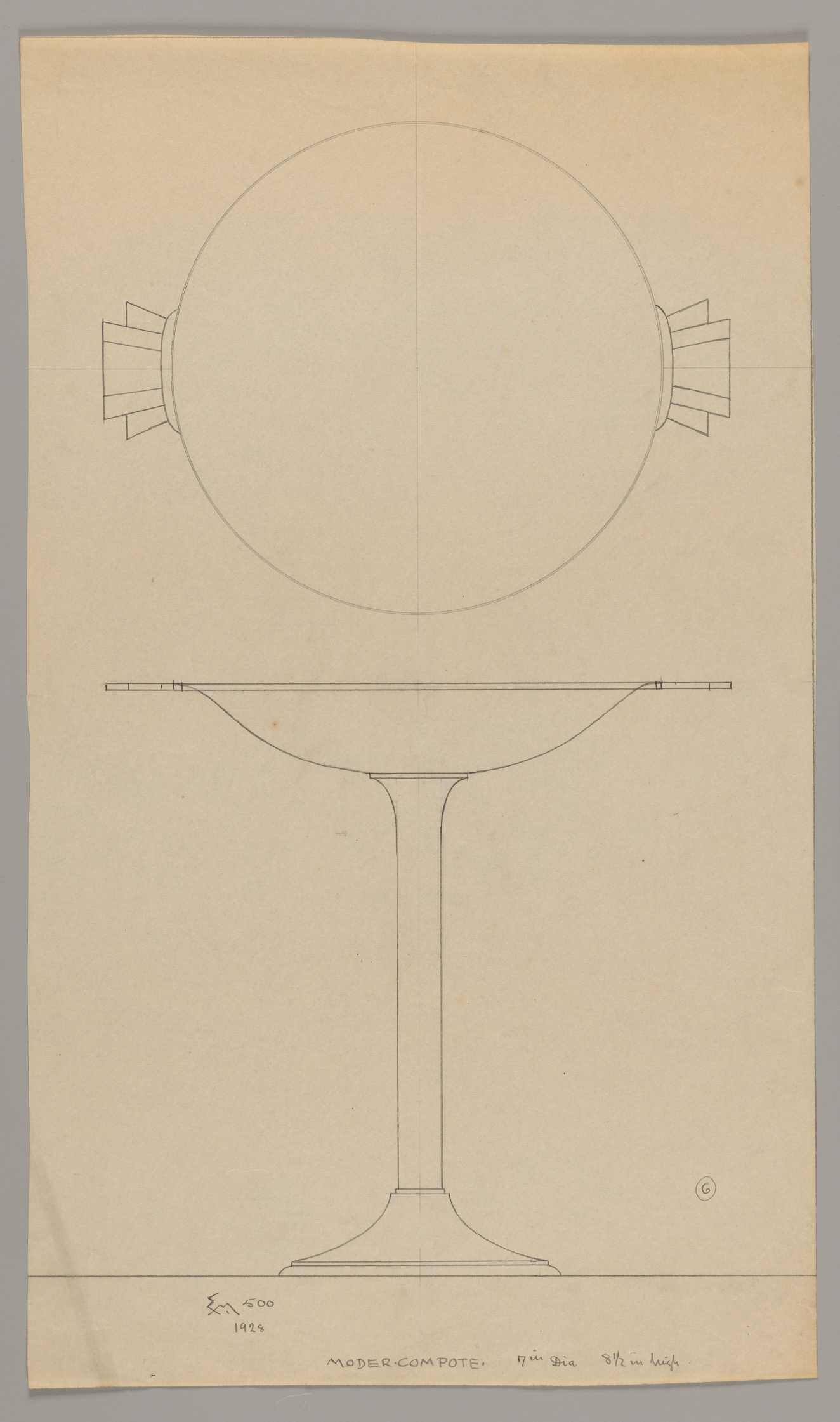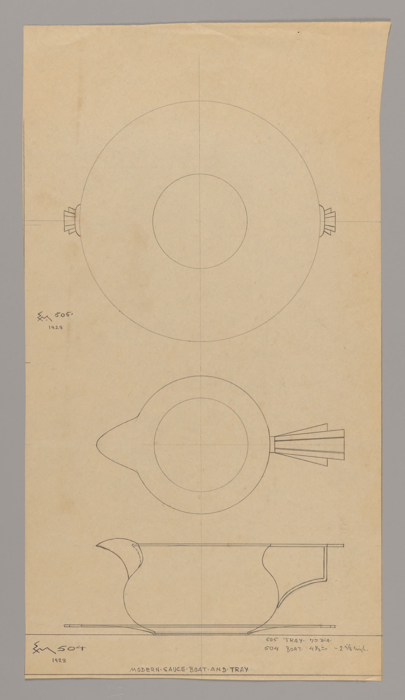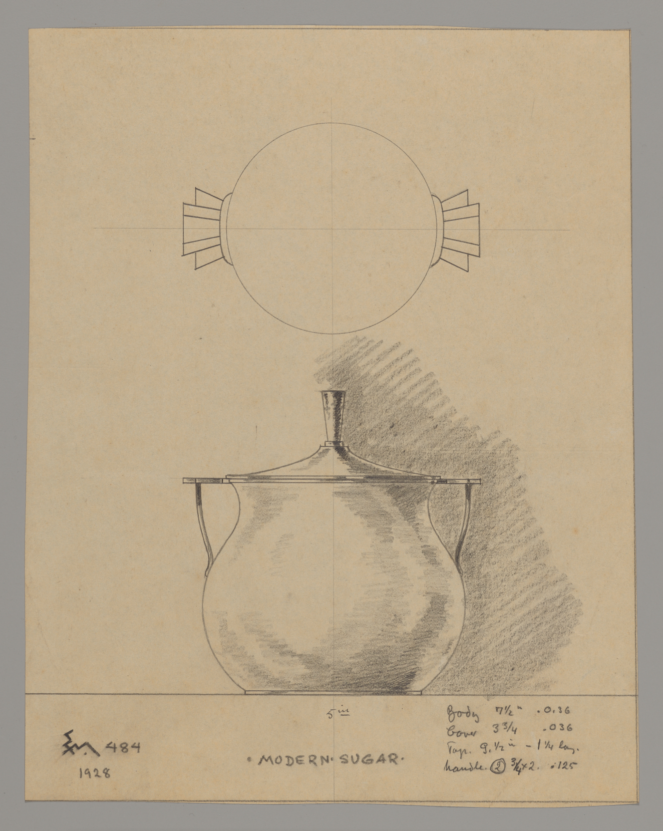 All in pencil: "EM. 497. / 1928" in lower left corner. ". MODERN . DOUBLE . DISH .8 in Dia4 9/16 high" below center of drawing across bottom of page. To bottom right of drawing: "Cover 7 3/4 in .036 / Body 9 1/2 in .036 / Base 5 1/2 in .036". "6" circled in lower right corner. "27 oz." to lower left of drawing.
