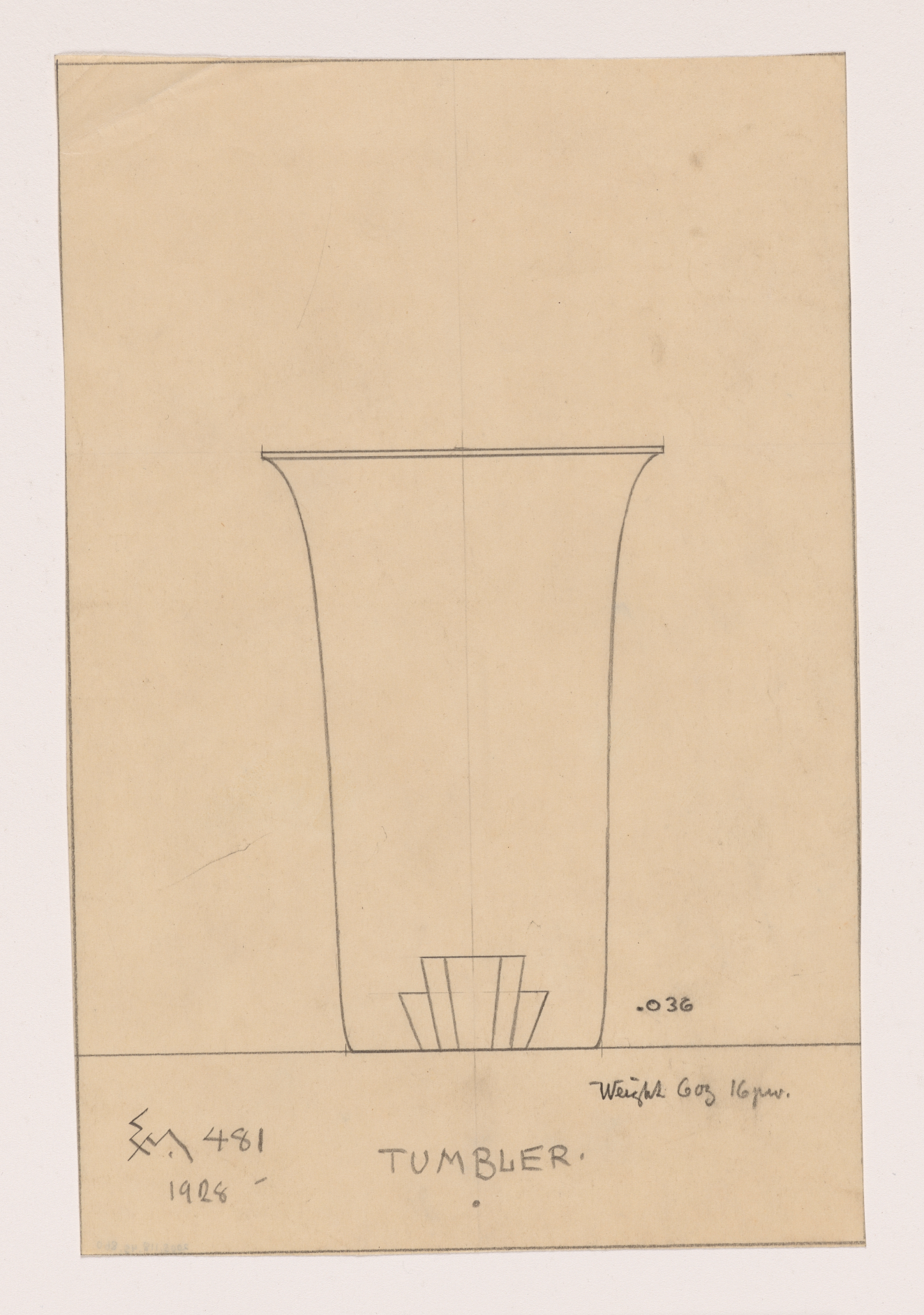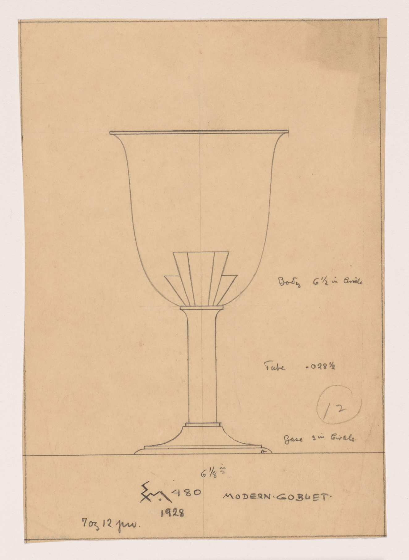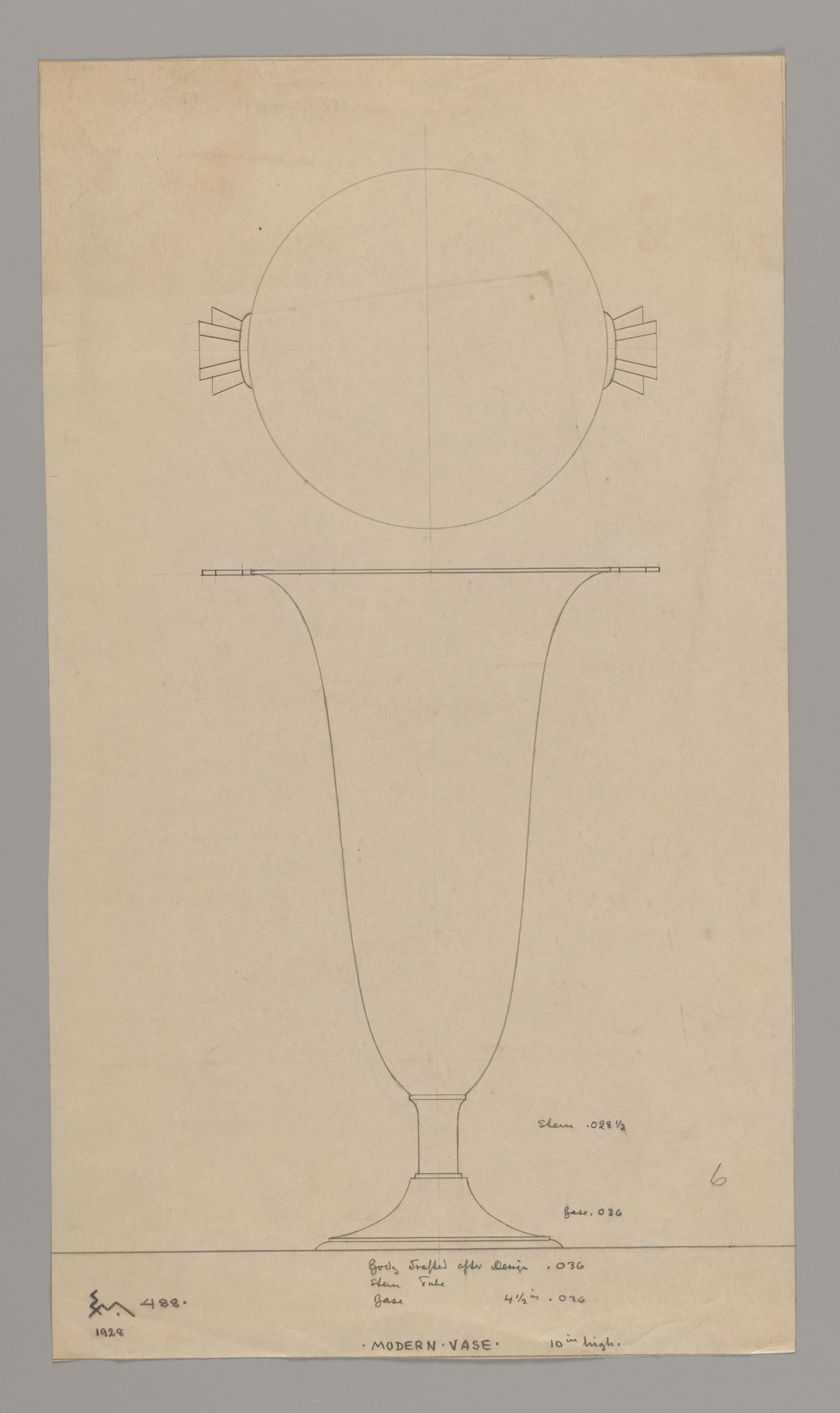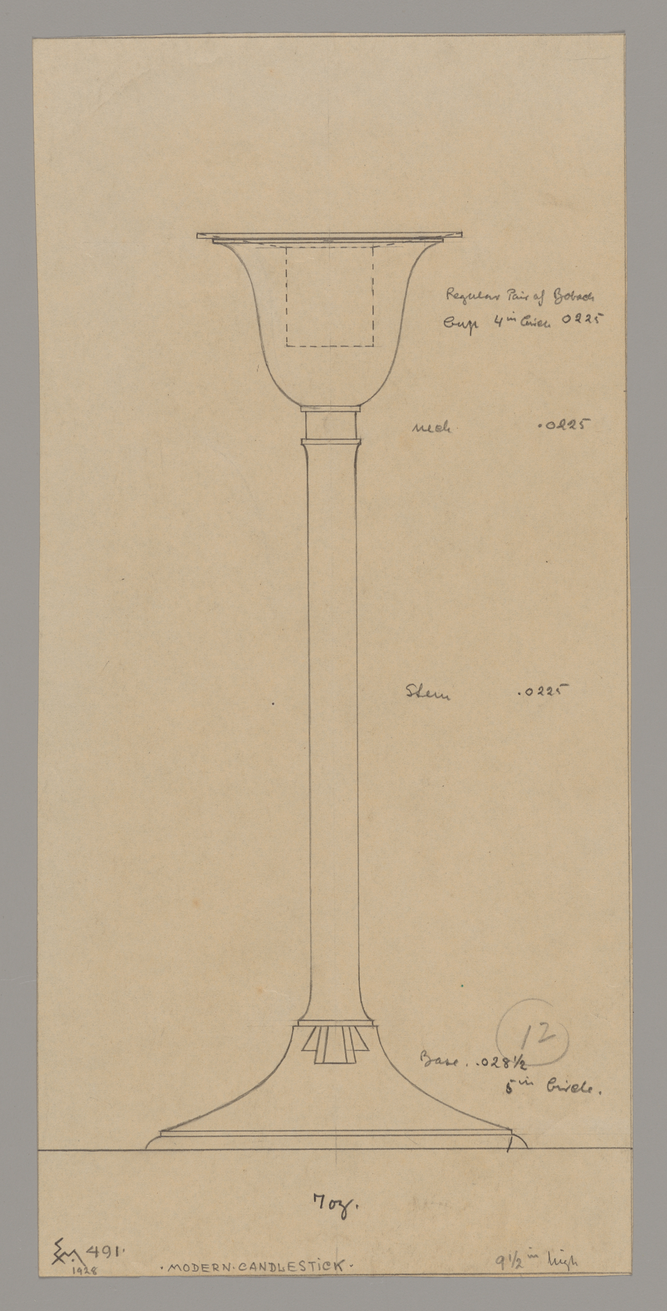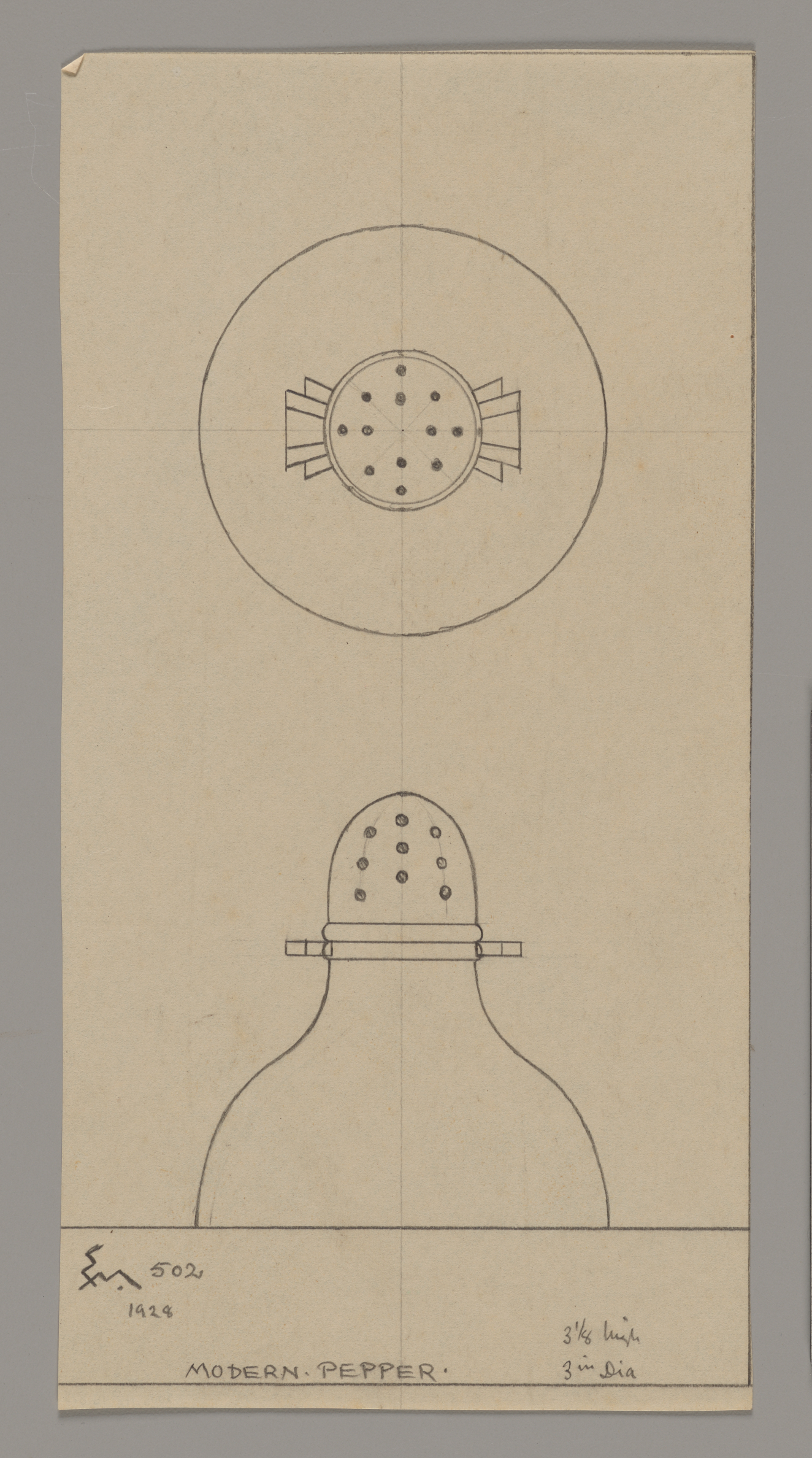 All in pencil: "EM. 497. / 1928" in lower left corner. ". MODERN . DOUBLE . DISH .8 in Dia4 9/16 high" below center of drawing across bottom of page. To bottom right of drawing: "Cover 7 3/4 in .036 / Body 9 1/2 in .036 / Base 5 1/2 in .036". "6" circled in lower right corner. "27 oz." to lower left of drawing.
