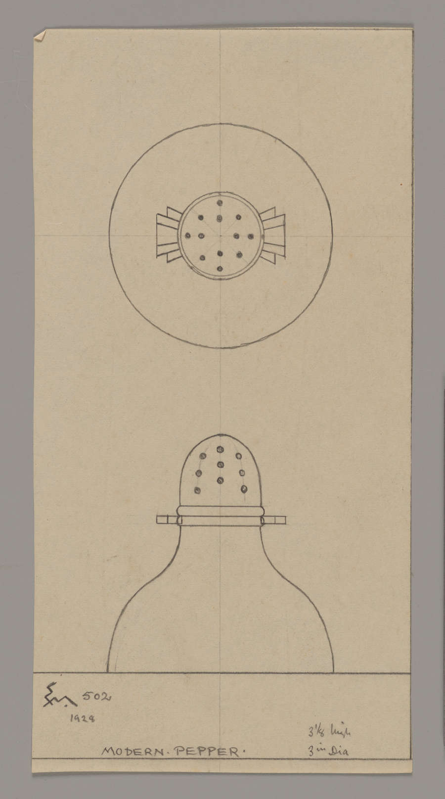 "EM. 502. / 1928" in lower left corner in pencil."MODERN . PEPPER. 3 1/8 high / 3 in Dia" in pencil across bottom of page.