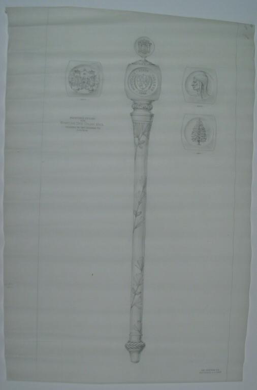 Ink stamp in lower right corner of drawing, "THE GORHAM CO. / PROVIDENCE , R.I. 02907" . In pencil to left of design, "PROPOSED DESIGN / FOR / MONTCLAIR STATE COLLEGE MACE / DESIGNED BY THE GORHAM CO. / 5-12-72 LS". "BACK", "RIGHT", and "LEFT" below boxes showing other sides of mace.Mace design includes inscription: "LIBERTY AND PROSPERITY / 1776" on the New Jersey state seal, "MONTCLAIR STATE COLLEGE / CARPE DIEM / 1908" on central face of mace. "maple / pine" in pencil script to left, along margin.
