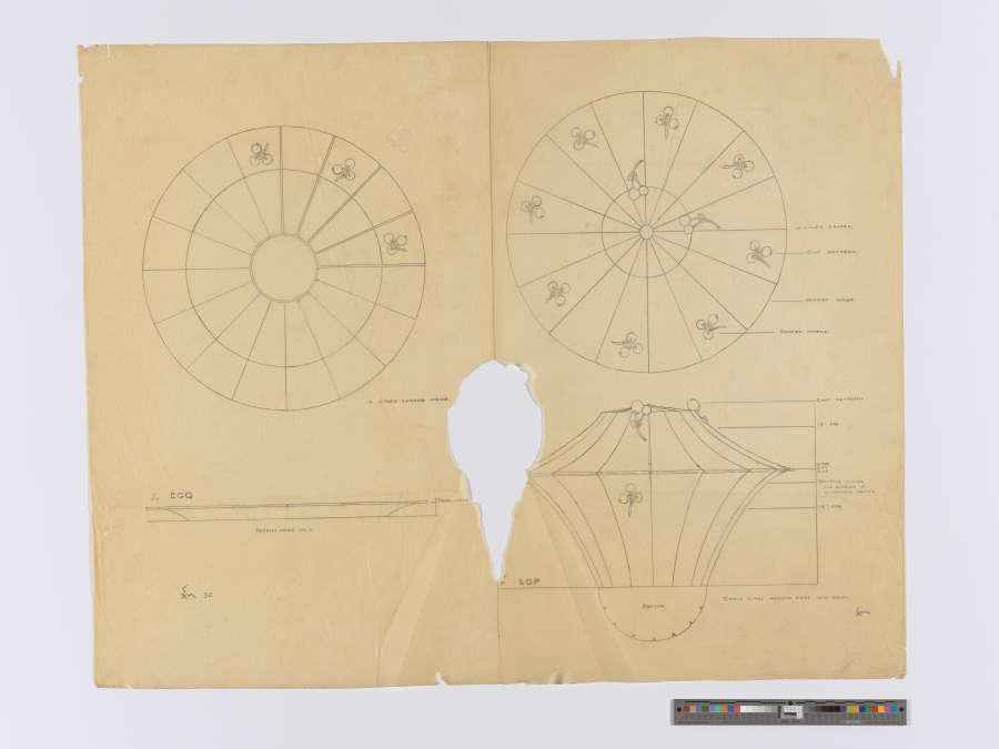 All in pencil: "EM 52" in lower left corner. "E/YHEGQ" above profile view of plate, "BERRIES INSIDE ONLY." below profile, "THICK EDGE" to right of profile. "16 LINES CHASED INSIDE." to lower right of plan view of plate. "[?]Y/P . EGP" to lower left of profile view of lidded bowl, "BOTTOM" with plan view of bowl's base, "CHASE LINES AROUND EDGE INTO BOWL." to lower right of profile view with "EM." Along right margin pointing to parts of lidded bowl, "16 LINES CHASED. / CAST PATTERN. / BERRIES INSIDE. / BERRIES OUTSIDE" with plan view of lid, "CAST PATTERN / 13" 036 / WIRE / 3X7 / 0X6 / BERRIES INSIDE / AND OUTSIDE IN / ALTERNATE SPACES. / 14" 036" to right of profile view.