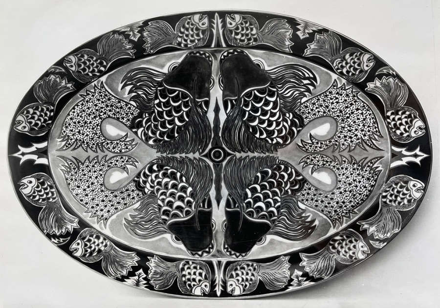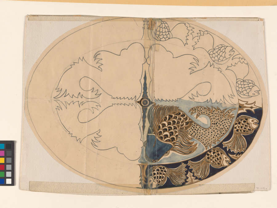Signed in gold on the design, towards LR:Simon Lissim. ; verso of mount, right:15A Platter/ Design by Simon Lissim/55 Magnolia Drive/Dobbs Ferry, N. Y., U.S.A./Simon Lissim/April 17, 1961