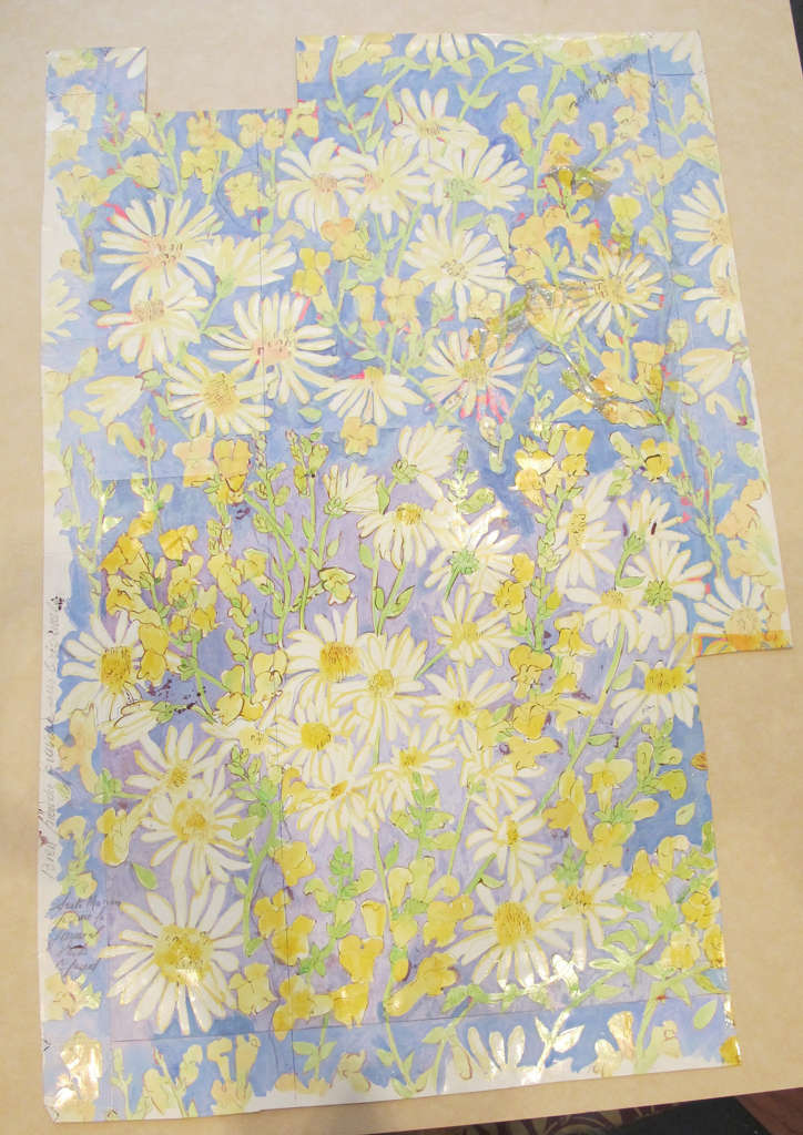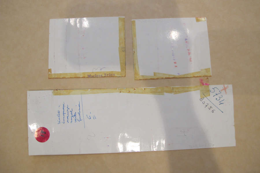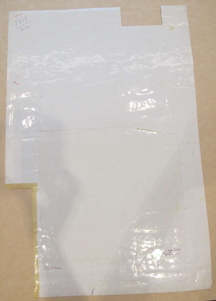 Recto (a): inscription: 5634 (paperclipped on) Verso (c): designer stamp, in ink :5734, red "X", red sticker: 18, production notations (see image)