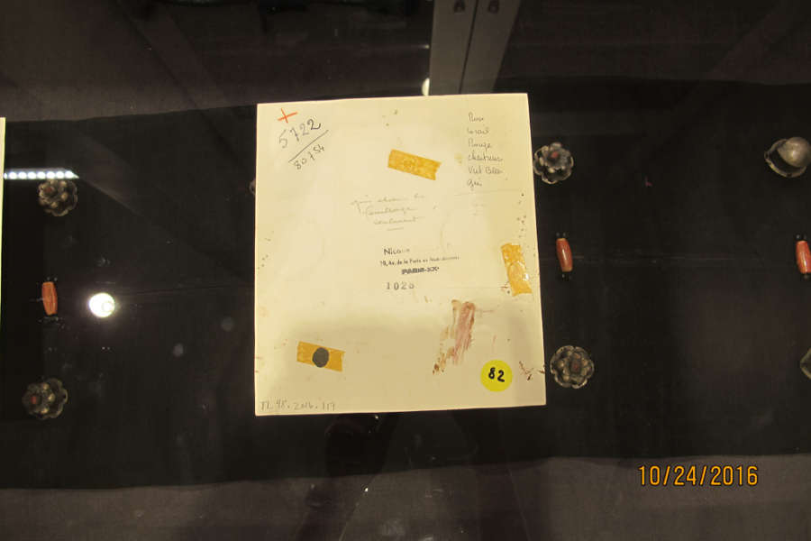 Verso: maker's stamp, yellow sticker "82", production notes, 5722/80754, red X, circular loss with tape Credit / Object Number