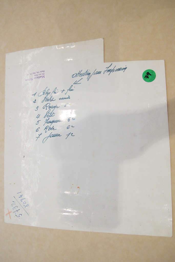 Recto: production notes ; Verso: designer stamp, in ink :5732, red "X", green sticker: 79, production notes (see image)