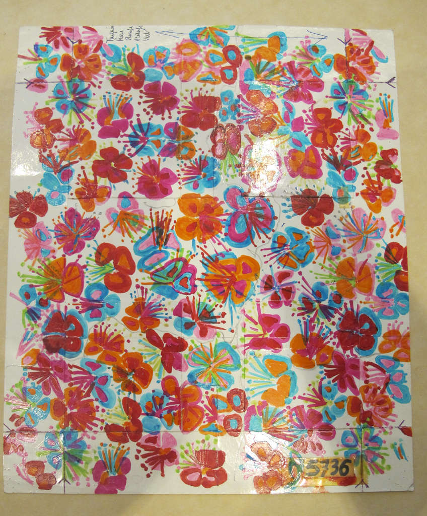 Recto: production notes, label: 5736 Verso: designer stamp, in ink: 5736, red "X", red sticker: 80, production notes (see image)