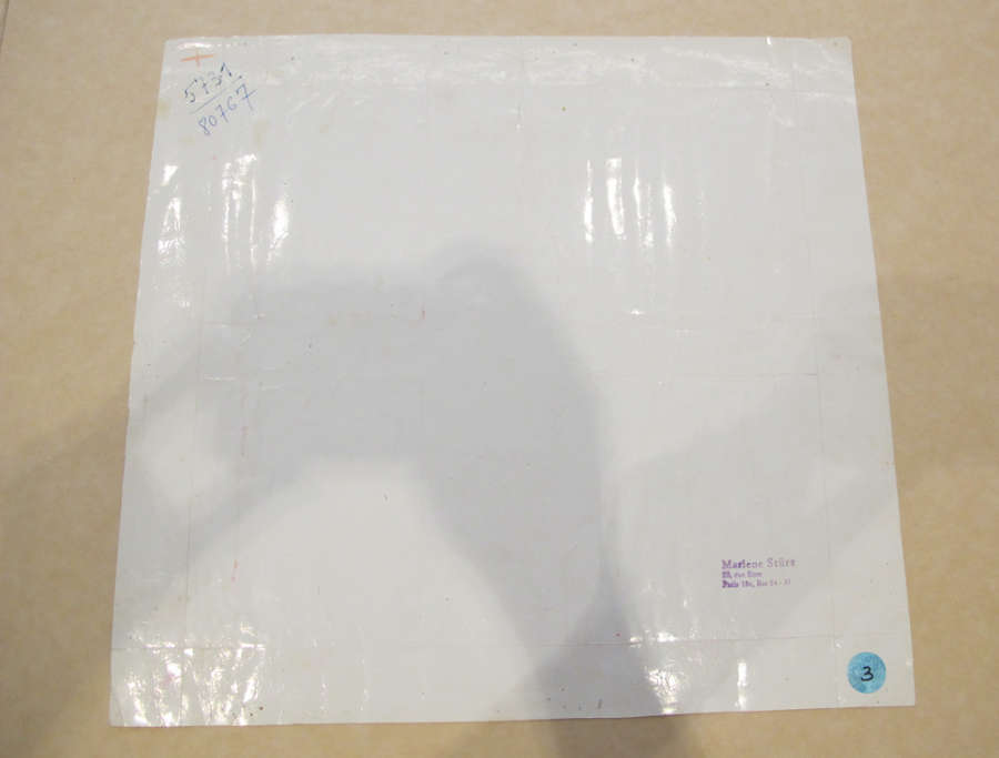 Recto: production notes; Verso: designer stamp, in ink: 5731, red "X", blue sticker: 3