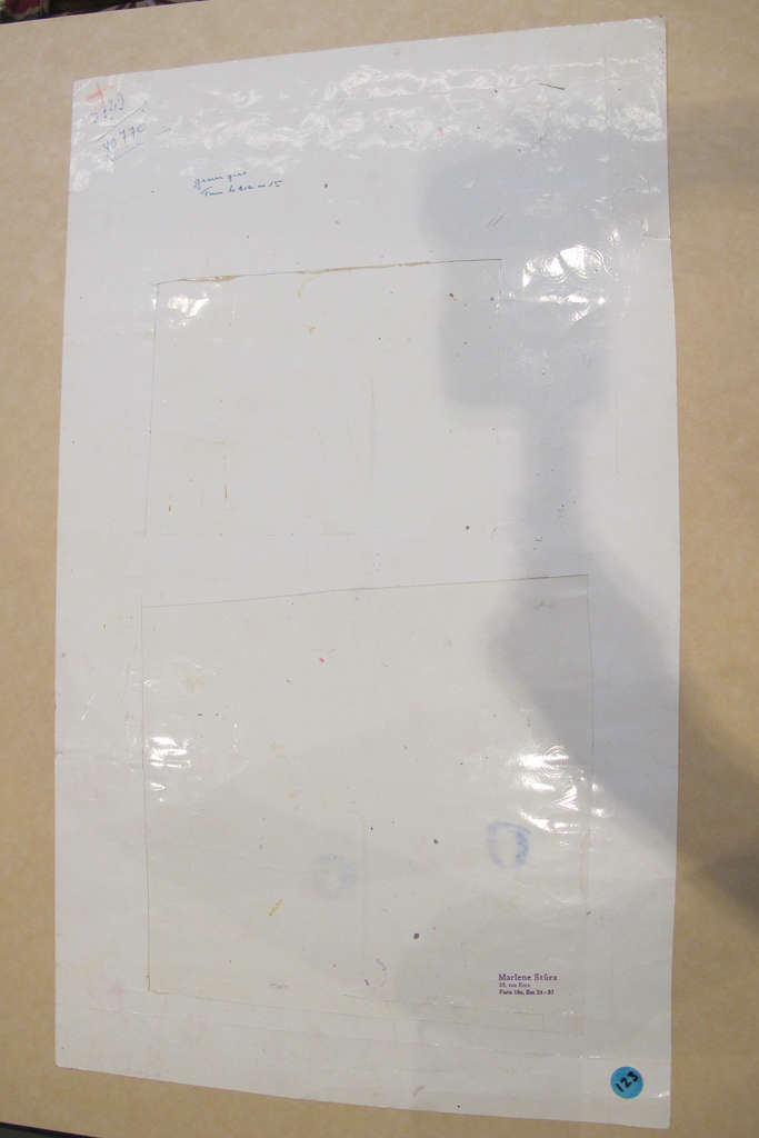 Recto: production notes; inscription: 5729 Verso: designer stamp, in ink: 5729, red "X", blue sticker: 123, production notes (see image)