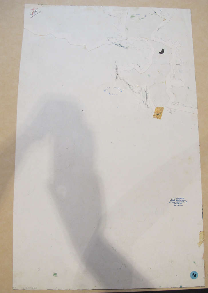 Verso: designer stamp, in ink: 4056, partial red "X", blue sticker: 78, partial 2nd design stamp