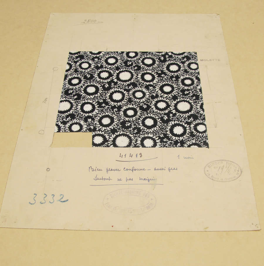 Recto : 3designer stamps (Molette), production notes, ink 41413, blue pencil 3332