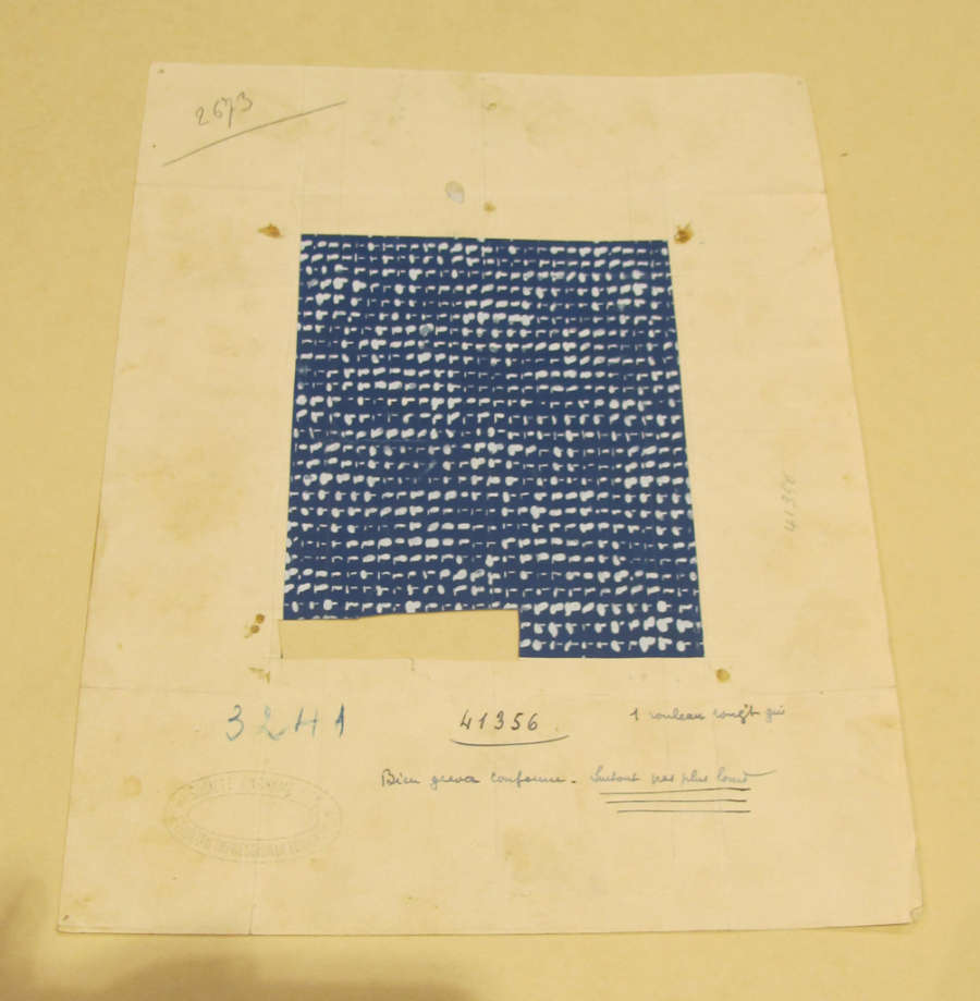 Recto : designer stamps, production notes, ink 41356, blue pencil 3241, pencil 2673