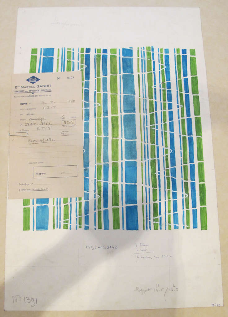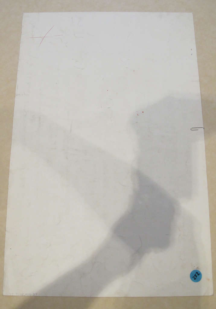 Recto: production notes (see image); order slip pinned to design ; Verso: red "X", blue sticker: 252