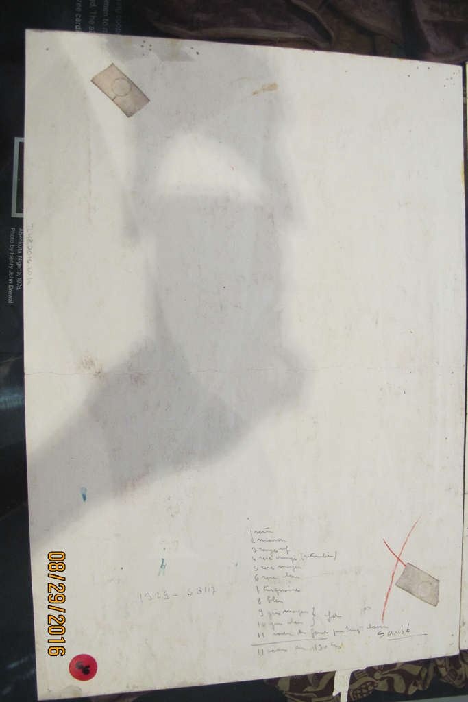 a: Verso: in black ink: 1329-S8117; red "X", red sticker: 6, production notes (see image)