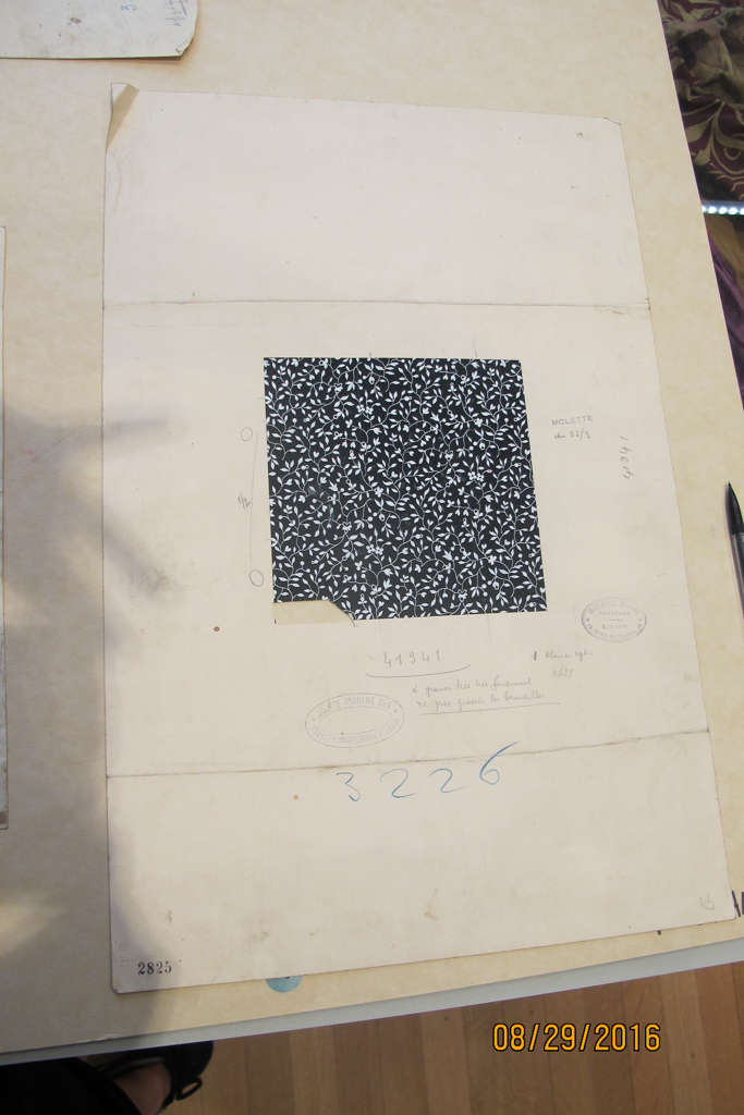 recto: 3 stamps, production notes, (41341); verso: red stick "46", blue sticker "48", small cut out area in design