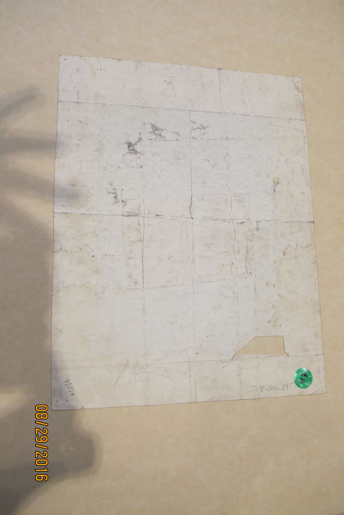 recto: 3 stamps, production notes, (41457); verso: green stick "117", production notes, small cut out area in design