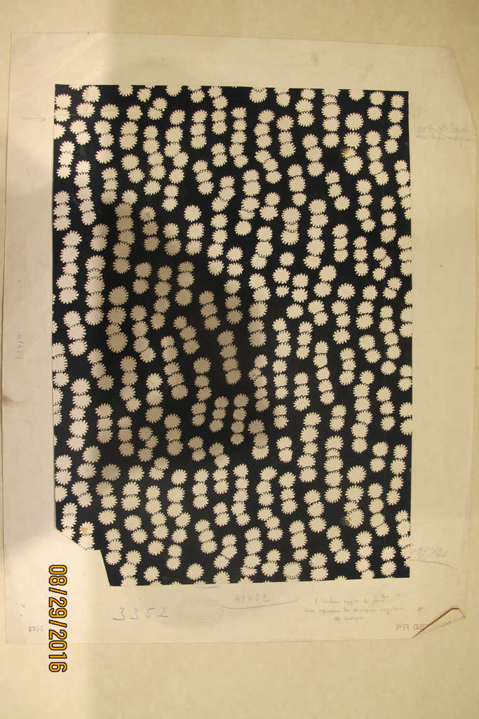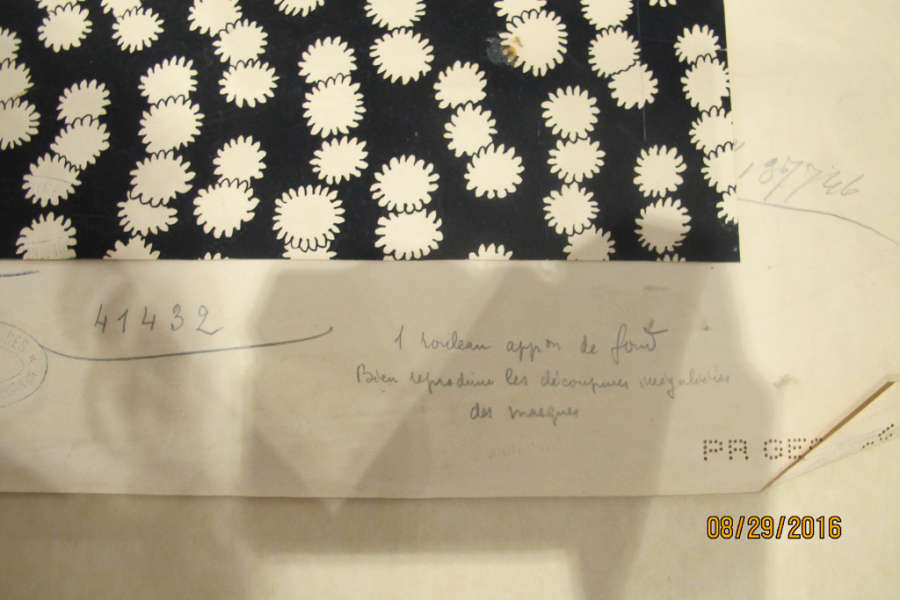 Sheet Recto: Two Designer stamp, blue crayon : 3352, production notes (see image) Credit / Object Number
