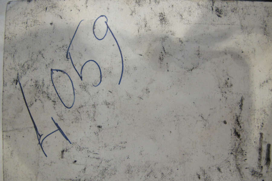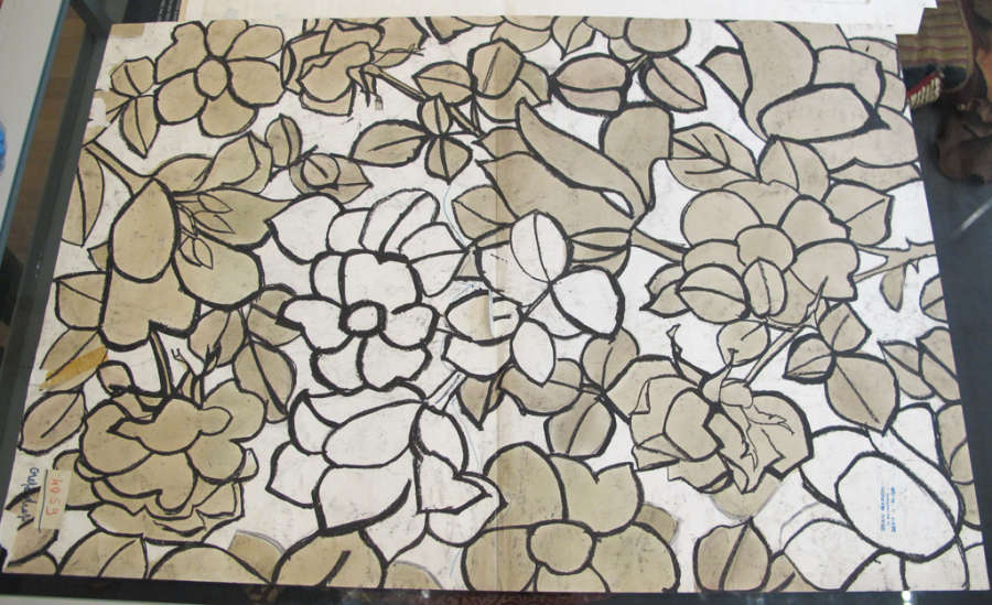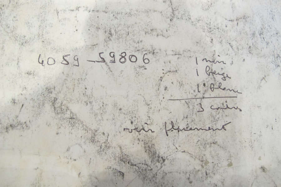 Recto: designer stamp, on label in red crayon: 4059; signature illegible; Verso: production notations (see image); in graphite: Bianchini