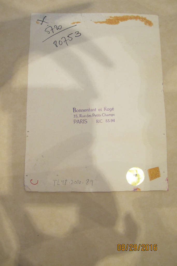 Recto: production notes, paper tag pasted to front 5720; Verso: designer stamp Bonnefant et Roge, yellow sticker "7", production notes
